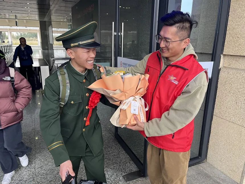 昔日从军报国,今朝荣归故里。又是一年退伍季,为扎实做好2024年退役军人光荣返乡工作,大力营造尊崇军人的浓厚氛围,让退役军人真切感受来自家乡的温暖和关爱,苍城镇退役军人服务站工作人员和退役军人家属等人组建成接兵“亲友团”,一行前往开平南站,迎接“最可爱的人”回家。 当退役军人从站口出来时,“亲友团”随即上前迎接,热情问候,并在现场举行了简单而热烈的欢迎仪式,感谢他们为国家贡献青春,为家乡争得荣光,让退役军人第一时间感受到家乡的温情和暖心服务。 接下来,苍城镇退役军人服务站将持续开展光荣返乡迎接活动,认真做好本年度春季退役军人报到登记、信息采集、组织关系转接、医保社保关系转接手续、优待证等“一站式”服务工作,并通过组织召开座谈会、走访慰问、就业创业宣讲会等服务,助力退役军人尽快融入地方,让他们切实感受到党和政府的关心和温暖。