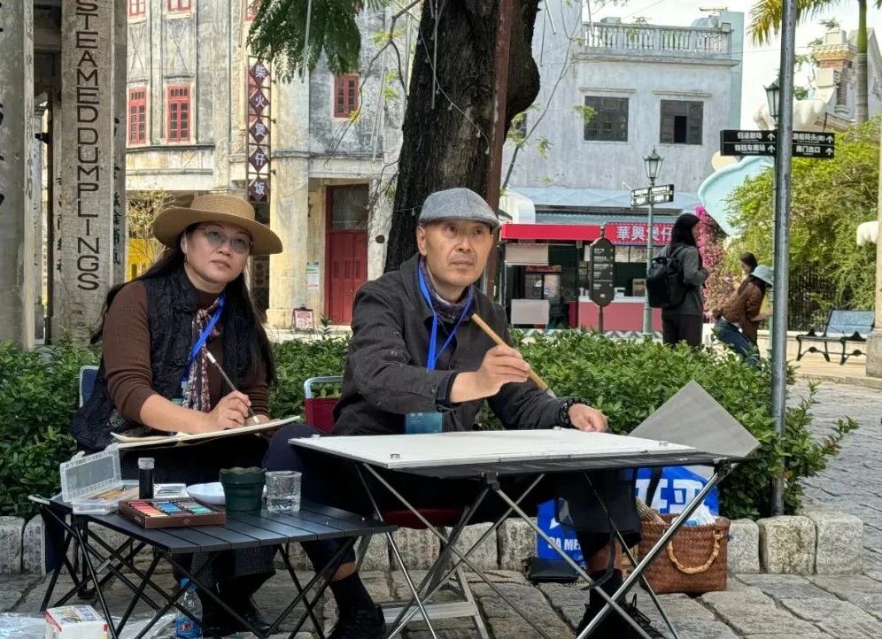 (从左至右)艺术家司徒衍斌、刘颖、张镇泮驻足画板前,挥笔绘就古镇肌理。