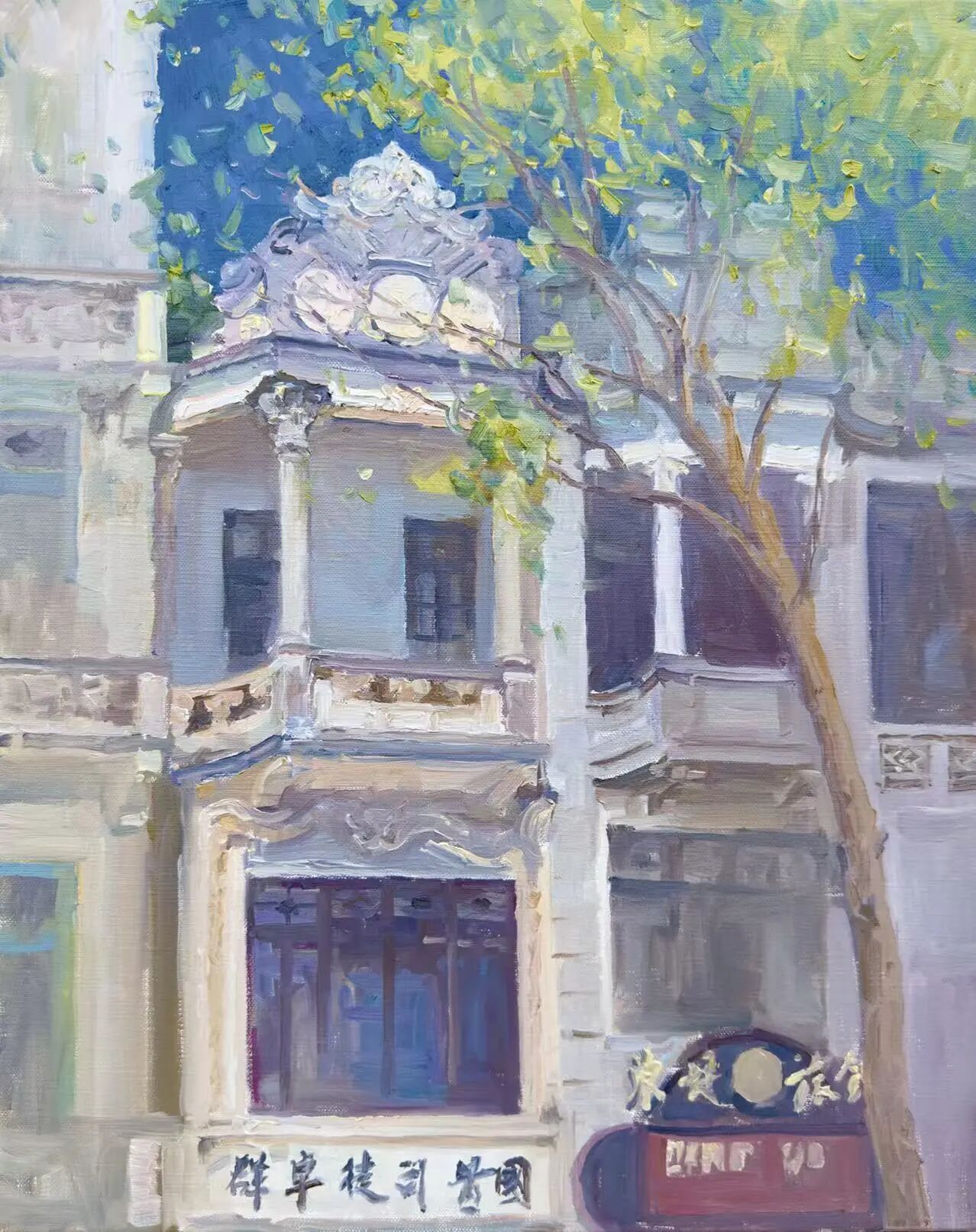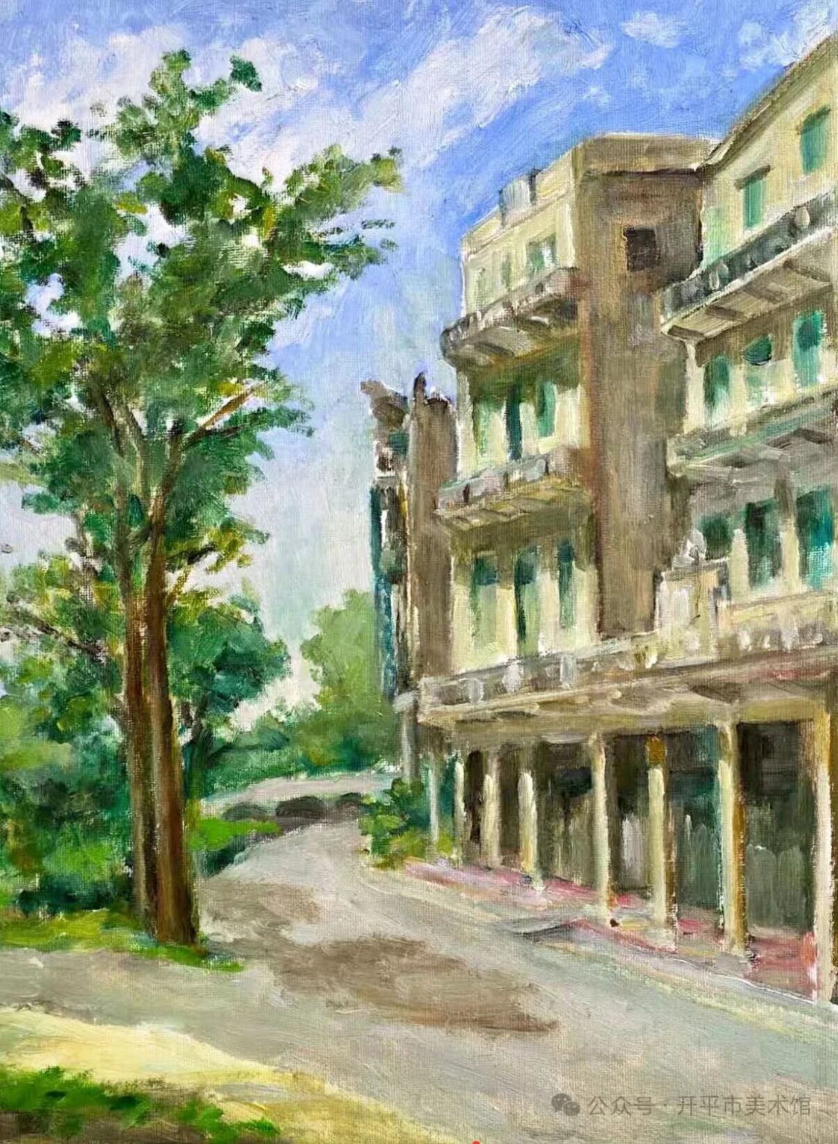 美国油画家协会大师级会员司徒绵先生,以凝练有力的笔触塑造骑楼风貌,记录儿时居住的老宅,尽显侨乡建筑的厚重质感。