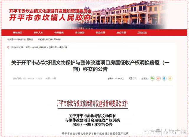 今天(4月23日),赤坎发布《关于开平市赤坎圩镇文物保护与整体改建项目房屋征收产权调换房屋(一期)移交的公告》(下简称《移交公告》)。