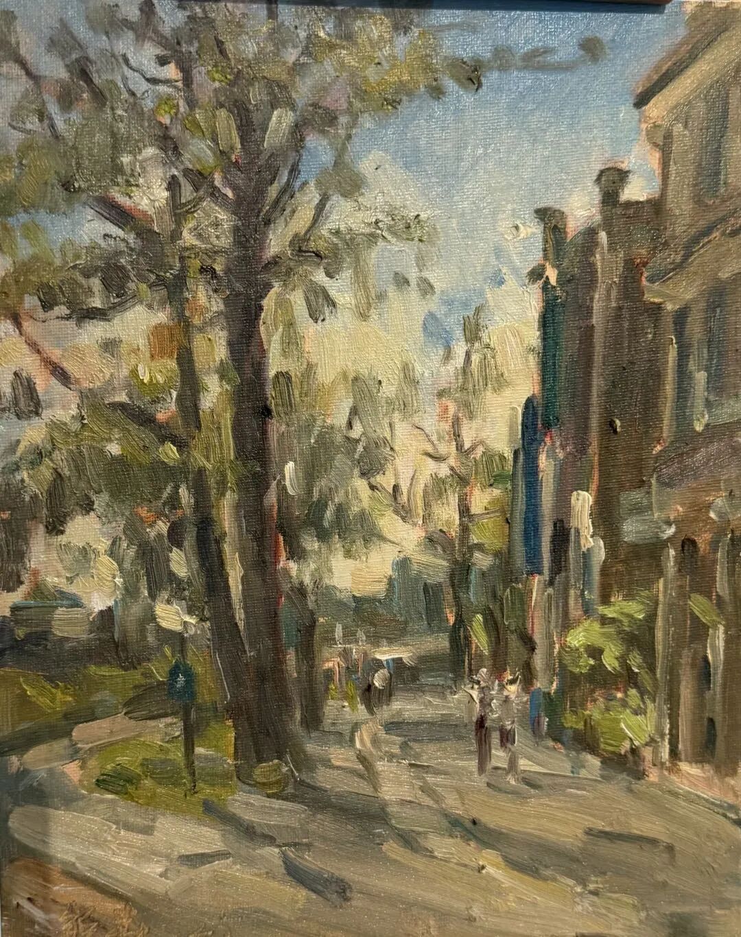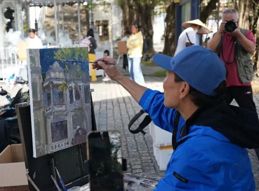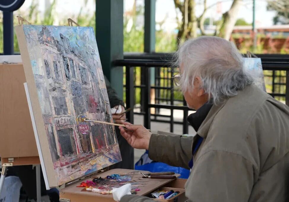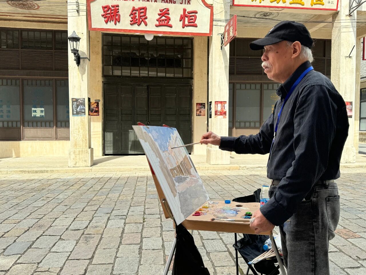 美国油画家协会大师级会员司徒维能凝神观照,挥笔绘写古镇晨间街道的鲜活景致。