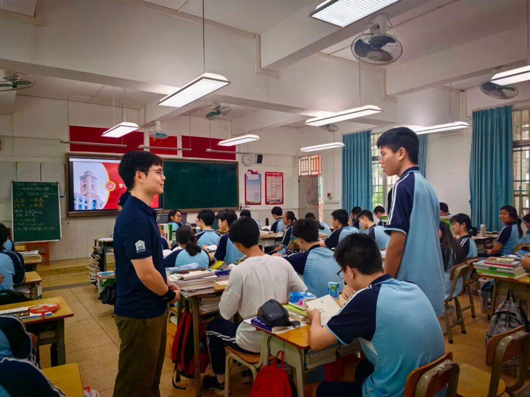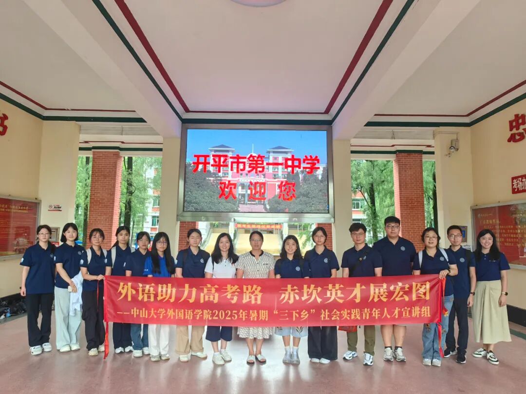 近日,中山大学外国语学院暑期公益实践团一行32人赴赤坎镇,开展“三下乡” 社会实践暨 “百千万工程” 突击队行动。实践团分为三个小分队,分别围绕助学宣讲、文旅调研、乡村教育三大领域开展活动,为赤坎镇教育提质、社区服务优化和农文旅融合发展注入青春力量。团队分3组行动,其中一分队到开平市第一中学,为即将迈入高三的学子送上“升学大礼包”。队员们详细介绍中山大学办学特色、招生政策及资助体系,重点分享英语学科的解题思路与分析方法。结合自身备考经历,队员们还讲解了时间规划、心态调节等实用经验。互动环节中,同学们围绕升学疑问积极提问,队员们结合政策要求和亲身经历耐心解答,现场氛围热烈温馨,为高三学子增添了备考动力。△团队走进开平一中开展宣传宣讲活动