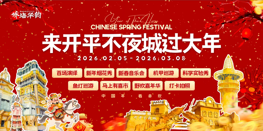 开平不夜城换上新春氛围装扮,准备好烟火市集、齐放孔明灯、焗鸡野炊、新春音乐会…...沉浸式享受野炊焗鸡和户外游戏双重体验,带你锁定马年年味之旅!