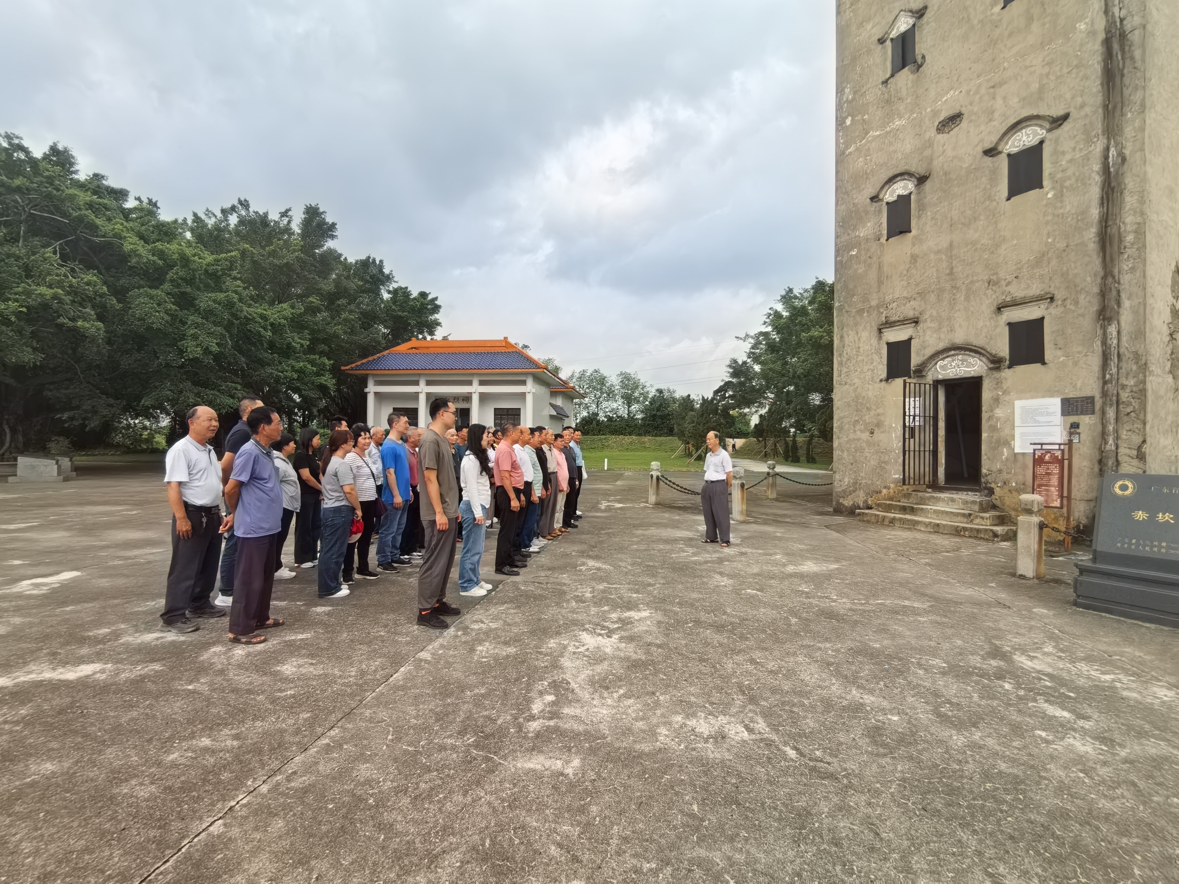 随后,一位退休的村党支部书记、村委会主任结合赤坎南楼的抗战历史,为大家生动讲述了“南楼七壮士” 浴血抗敌、壮烈殉国的英雄事迹,带领大家实地瞻仰碉楼遗迹,感悟革命先辈保家卫国的崇高气节。现场通过参观文明宣传展陈,引导党员群众将爱国情怀与文明新风相结合,推动社会主义核心价值观融入日常。