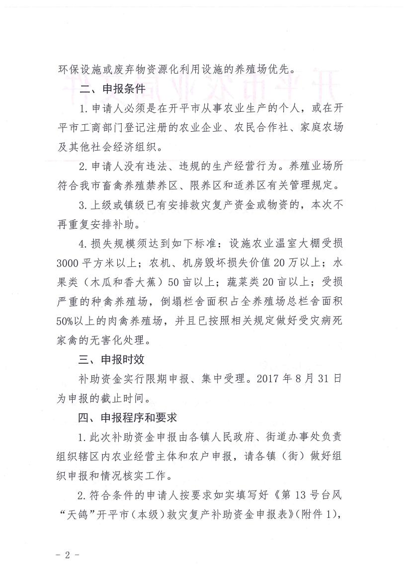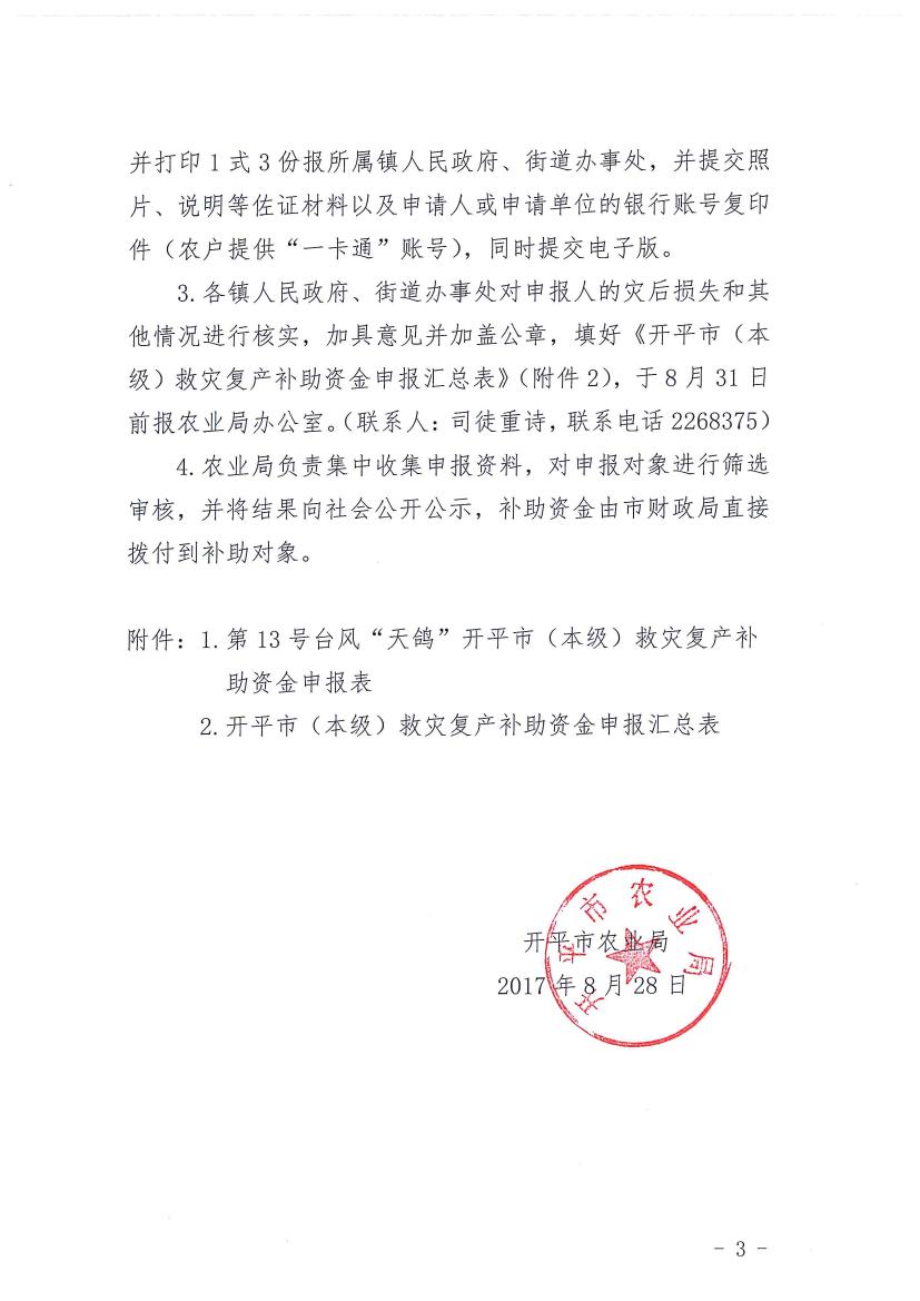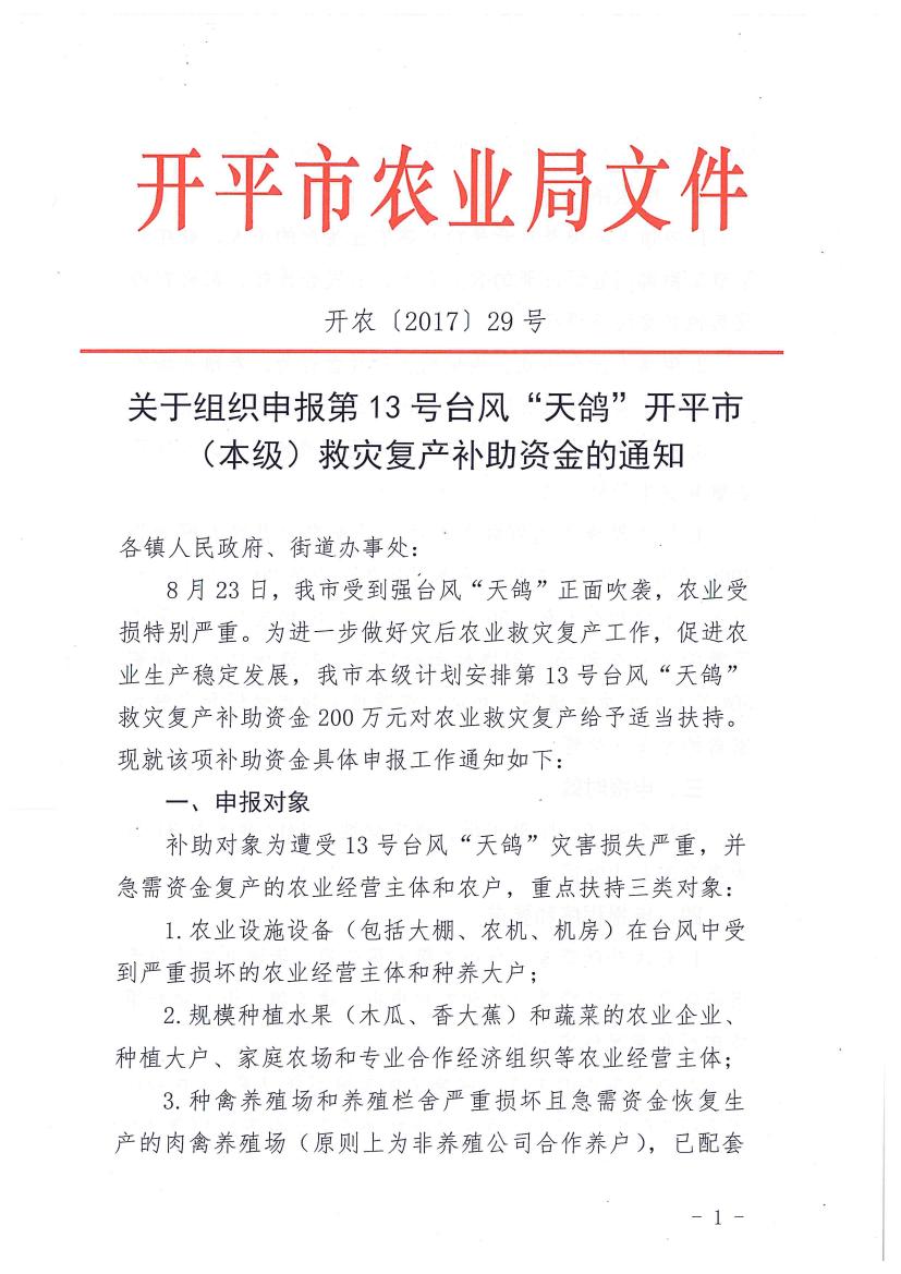 关于组织申报第13号台风“天鸽”开平市(本级)救灾复产补助资金的通知