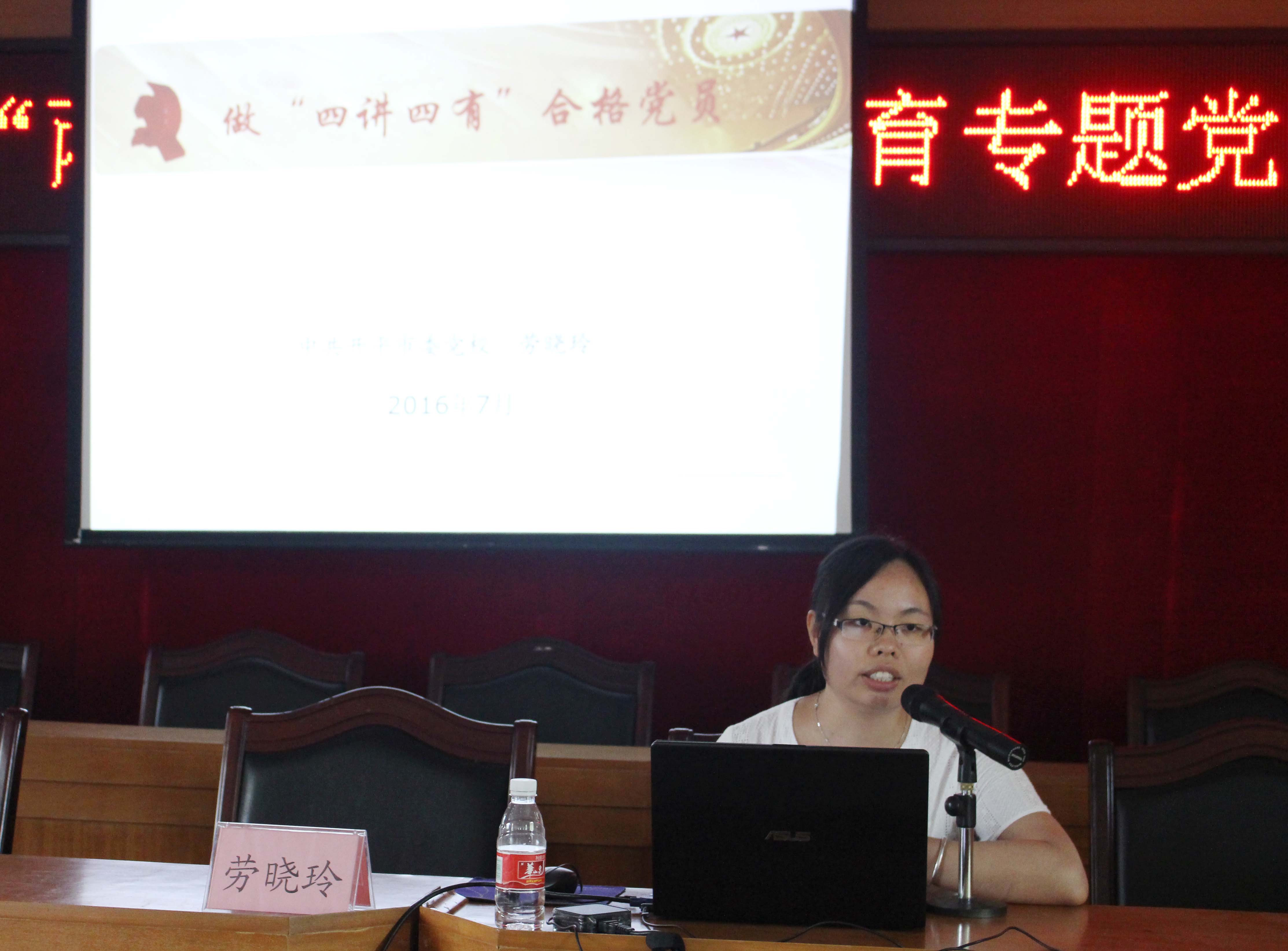 专题党课专门邀请到市委党校教研室副主任劳晓玲同志现场授课。劳晓玲老师以《做“四讲四有”合格党员》为题,从讲政治,有信念;讲规矩,有纪律;讲道德,有品行;讲奉献,有作为四方面深入浅出对马克思主义中国化,中国特色社会主义伟大实践,党章,党纪,党员廉洁自律规范等多方面展开阐述。