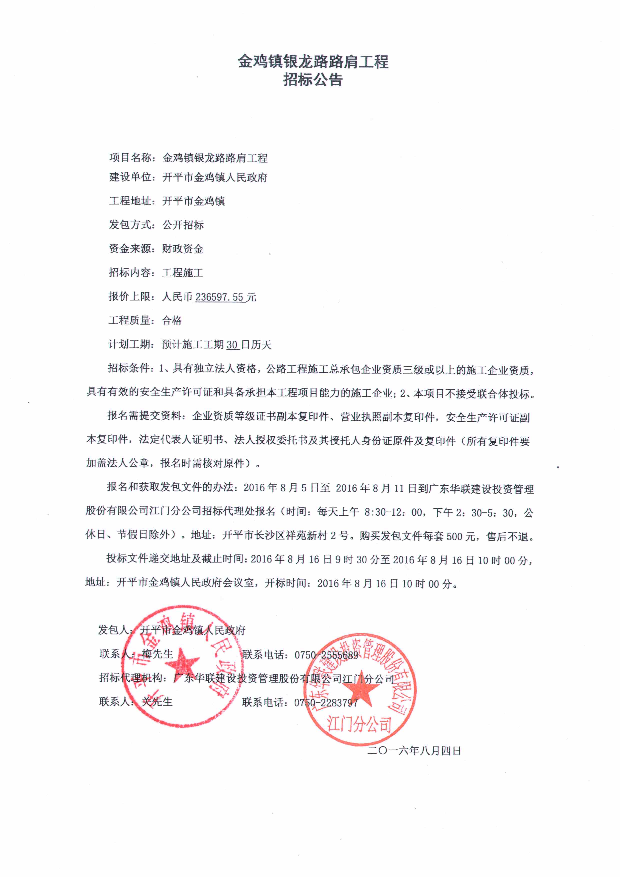 金鸡镇银龙路路肩工程招标公告
