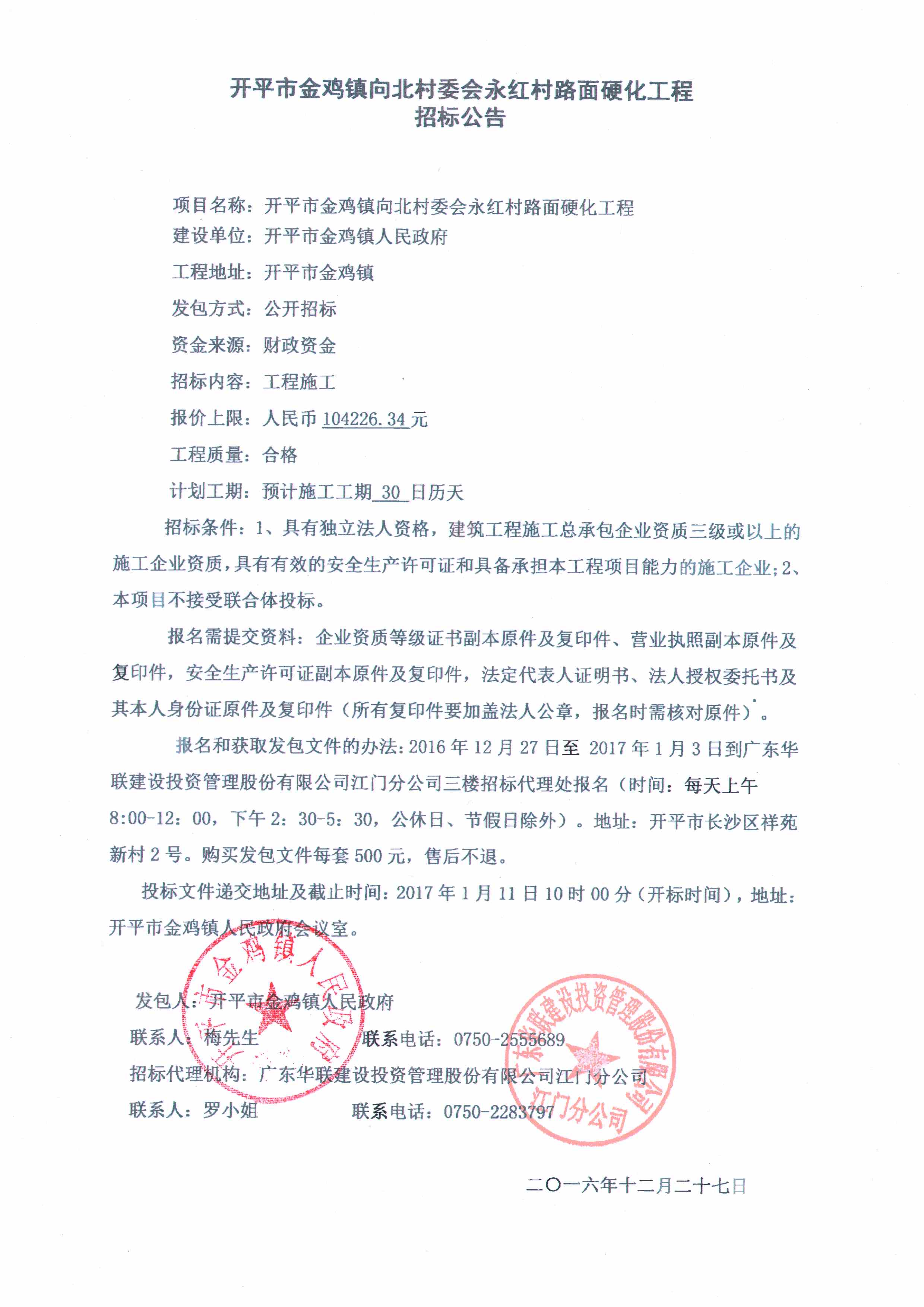 开平市金鸡镇向北村委会永红村路面硬化工程招标公告