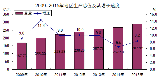 初步核算,2015年全市实现地区生产总值287.92亿元(当年价),比上年增长8.2%。其中:第一产业增加值27.72亿元,增长3.2%;第二产业增加值141.58亿元,增长8.5%;第三产业增加值118.62亿元,增长8.9%。第一、二、三产业增加值的比重为9.63:49.18:41.19。人均地区生产总值4.07万元。