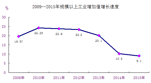 2015年,全市规模以上工业企业257家,规模以上工业增加值比上年增长9.1%,工业总产值比上年增长15.37%。工业总产值中,按轻重工分:轻工业增长17.38%,重工业增长13.40%;按企业经济类型分:外商及港澳台商投资企业增长13.20%;股份制企业增长17.10%;其他经济类型增长28.08%。