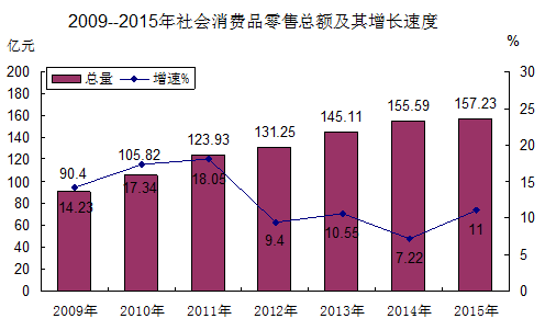 全年社会消费品零售总额157.23亿元,比上年增长11.00%。其中:城市消费品零售额111.75亿元,比上年增长12.84%;农村消费品零售额45.48亿元,比上年增长6.72%。