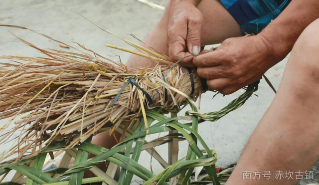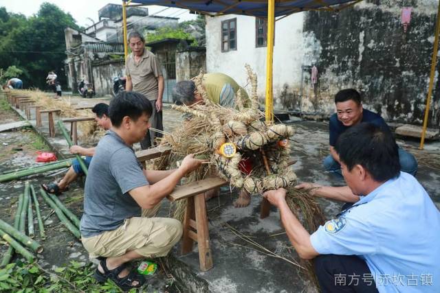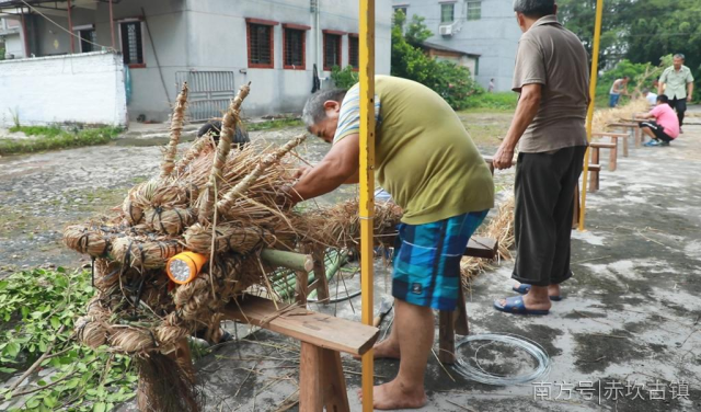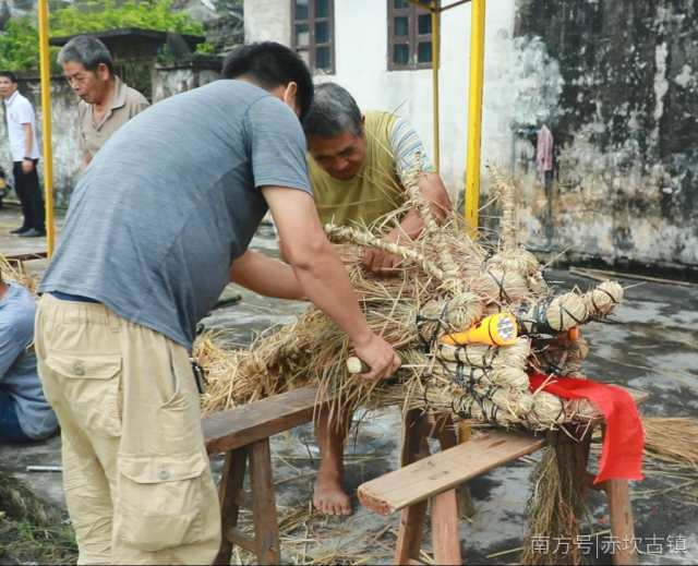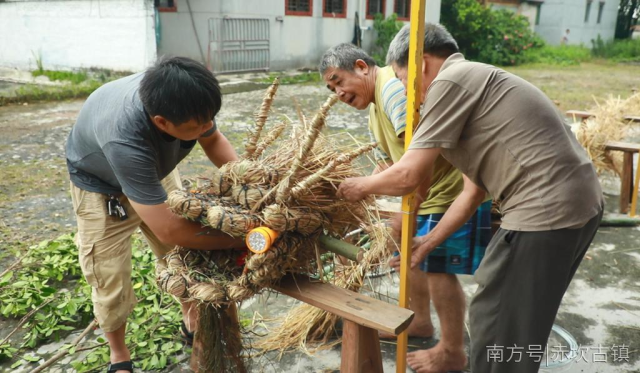 (3)用大约20斤稻草,分别扎成10来个“草髻”,每个大概20厘米长,然后扎紧在龙头的各个部位。其中,这里要选择直直的稻草来扎,不够直的无法立起来做“草髻”。而且这一步十分考验师傅的技艺,不能随便扎,要扎紧扎稳,不然舞龙时候松动掉下来就不行了。
