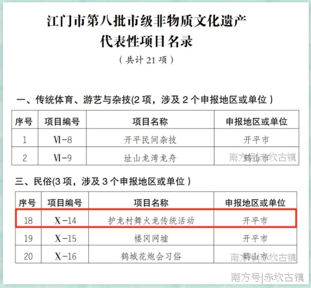 近日,江门市人民政府公布江门市第八批市级非物质文化遗产代表性项目名录,开平市赤坎镇护龙村舞火龙传统活动榜上有名,成功入选为江门市级非遗项目!