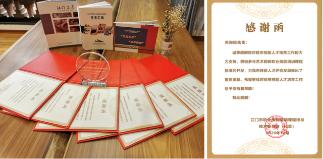 图4 艺术砌砖职业技能培训课程标准入选证书及感谢函