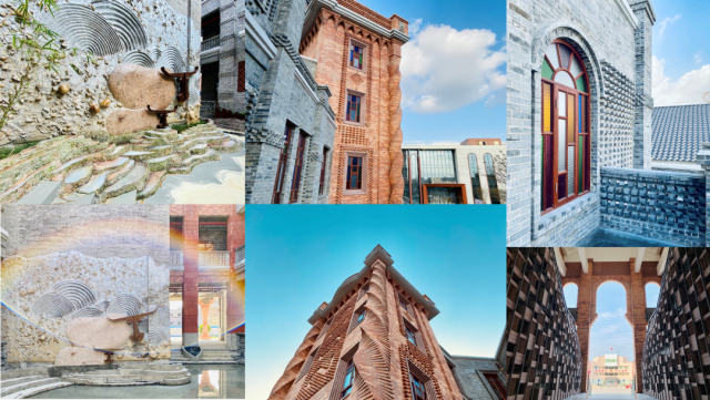 之后,农民工匠利用这些自带当地文化记忆的砖块,依据地域性环境进行二次创作,发展出花样繁多的砖砌工法。现场施工过程中,很多建筑细节都是农民工匠创新融合中西方建筑元素,依靠民间建造工艺智慧,即时、在地进行勾画草图,现场砌筑大样,然后直接落地成为景观与建筑的一部分。
