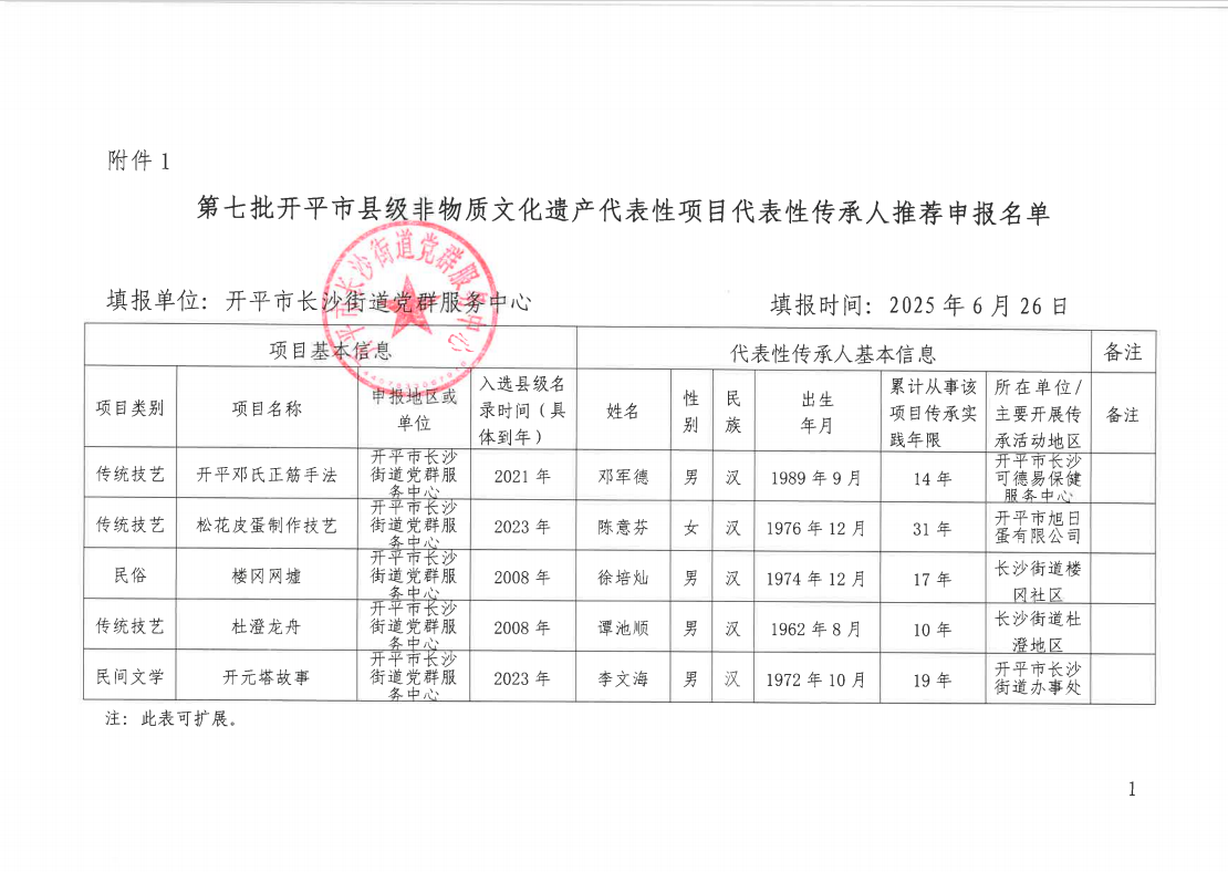 根据《中华人民共和国非物质文化遗产法》和《广东省非物质文化遗产条例》的规定,现将长沙街道推荐第七批开平市县级非物质文化遗产代表性项目代表性传承人名单进行公示,公示期十天: