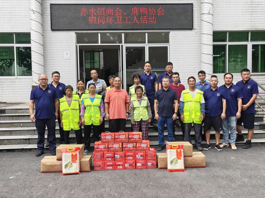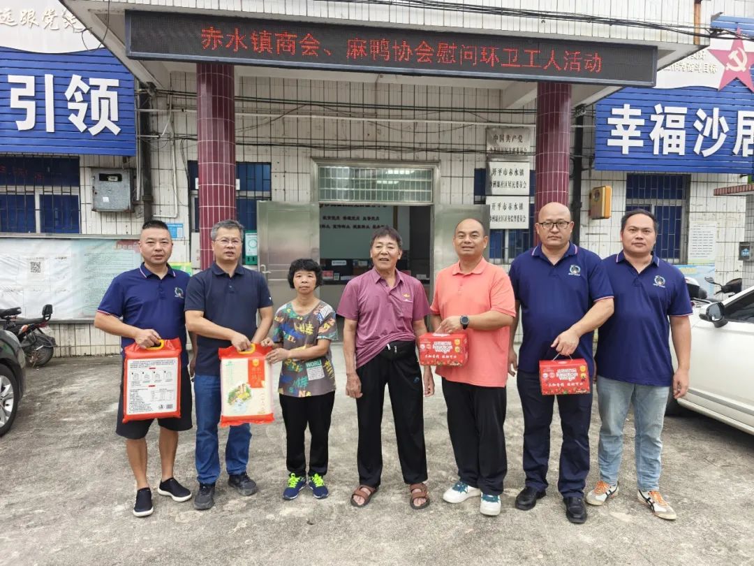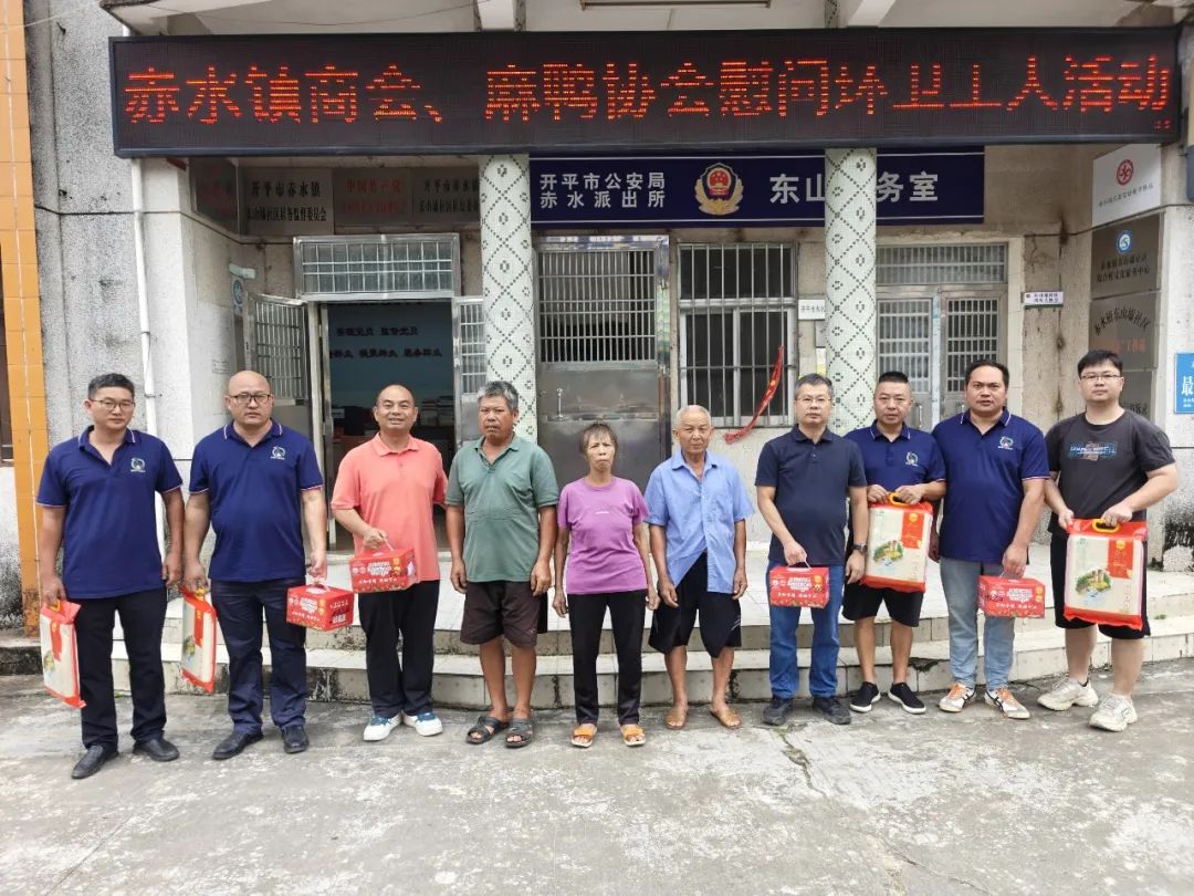 持续高温给环卫工作带来严峻“烤”验,8月14日上午,赤水镇联合镇商会、开平市麻鸭产业协会开展“送清凉”慰问活动,向全镇20余名一线环卫工人赠送“赤水优品”礼包(含山楂醋、大米等物资)。黄大勇、张晓冉以及麻鸭产业协会会长、商会代表樊劲松等参加慰问。