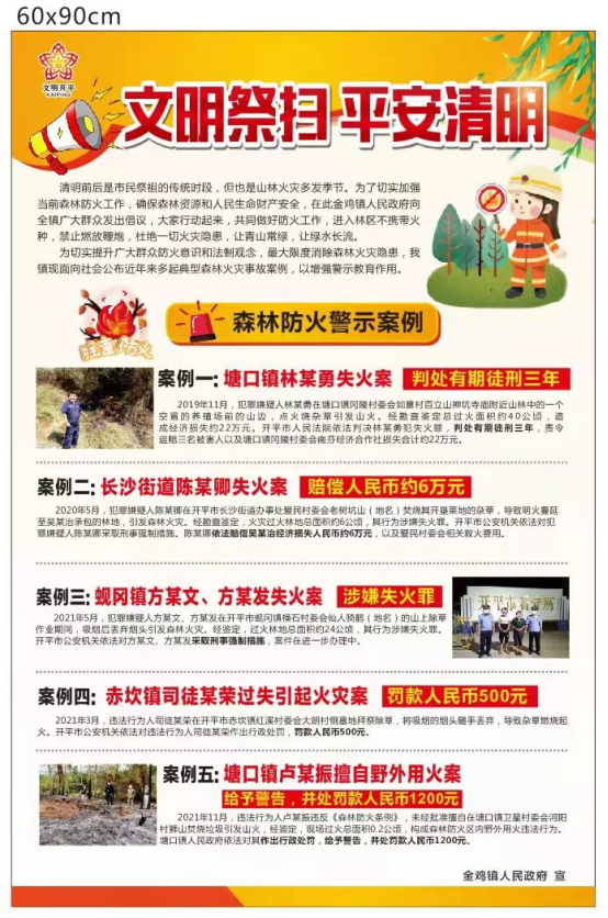 我镇不少地区历来有提前开展祭祖的习惯,每年农历二月初二后至清明节期间,群众便陆续进山扫墓祭拜。春季历来是森林火灾高发时期,一点星星火,可毁万亩林。为传播文明新风,严防森林火灾,最大限度保护人民群众生命财产和森林资源安全,金鸡镇人民政府特向全镇人民发出如下倡议: