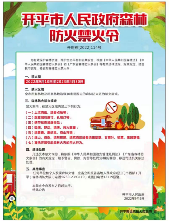 四、做火情预警的情报员。请广大居民朋友积极支持森林防火预警工作,发现火情时第一时间拨打金鸡镇森林防火报警电话“0750-2555119”。并尽快远离火场和林区,寻找安全地方避险,确保自身安全。