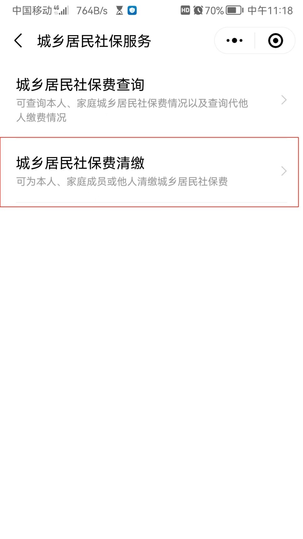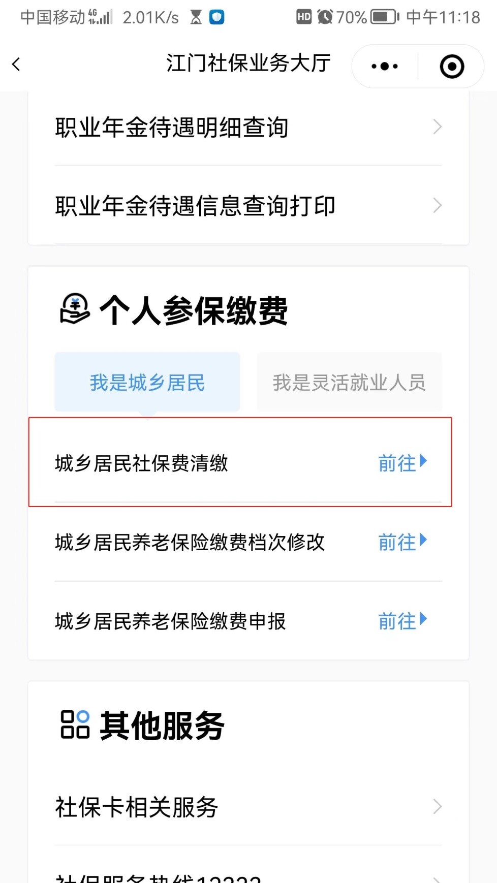 下拉页面至“个人参保缴费”项,选择“城乡居民社保费清缴”