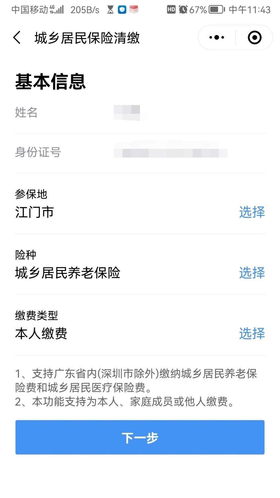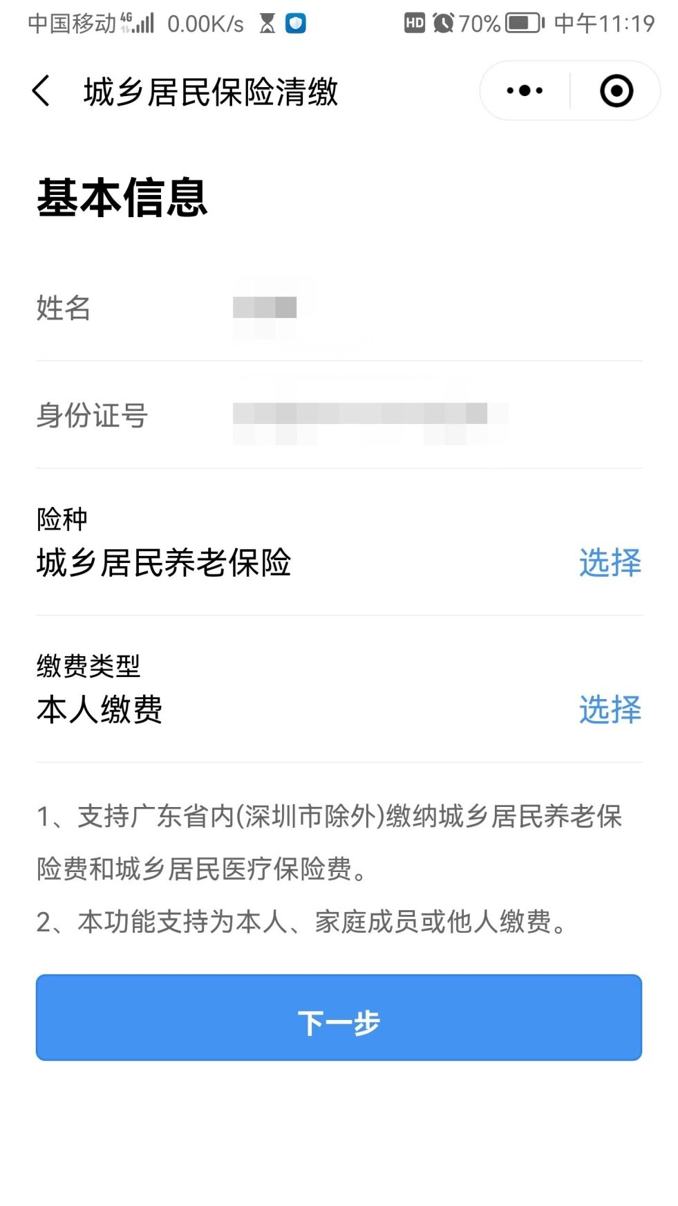 选择对应险种和缴费类型后,点击“下一步”完成缴费