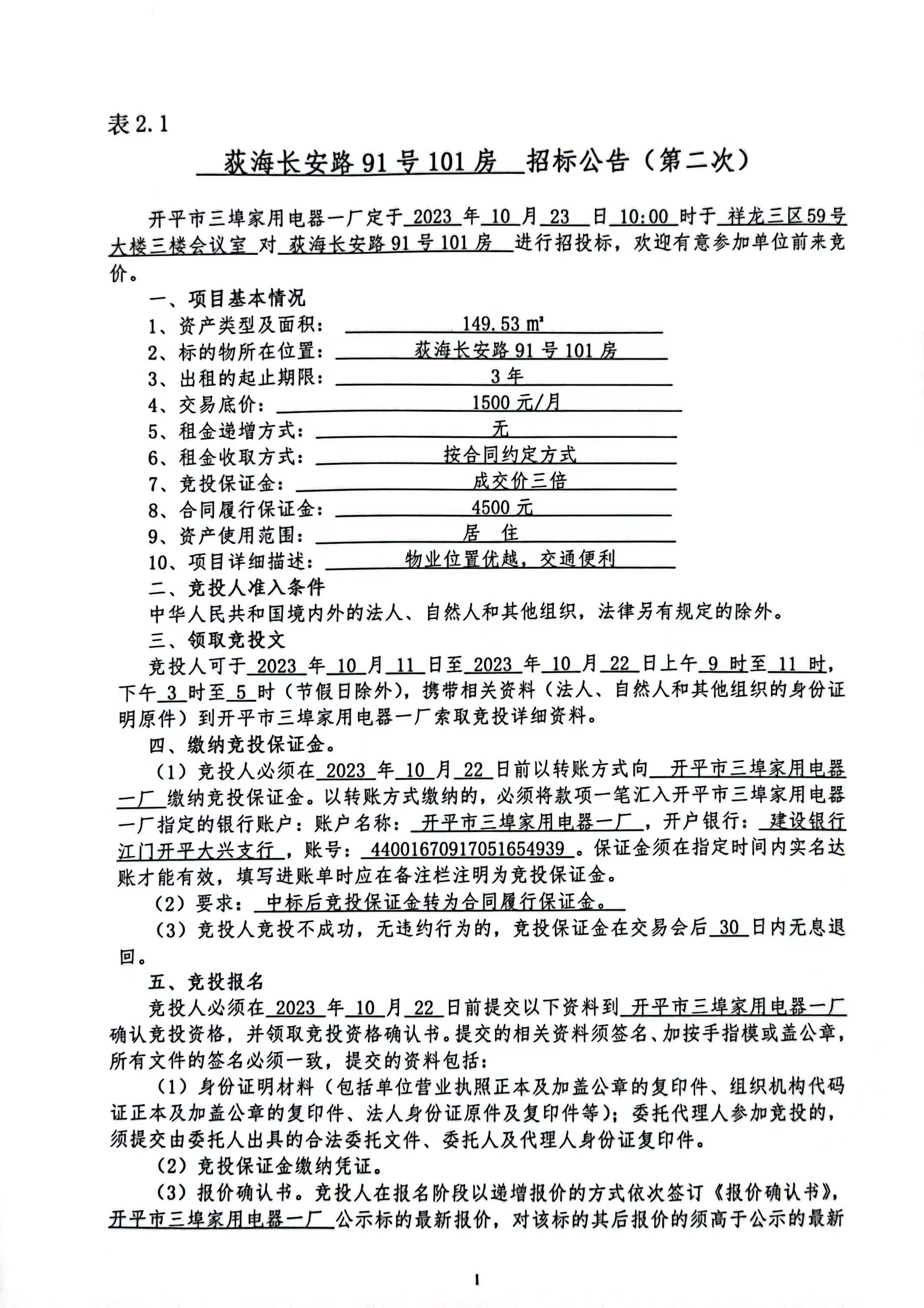 荻海长安路91号101房招标公告(第二次)