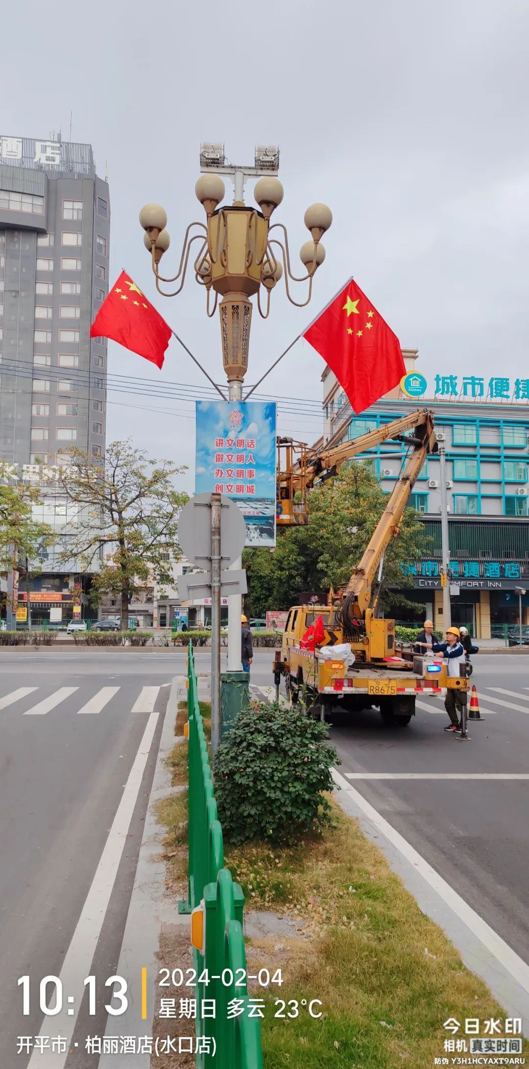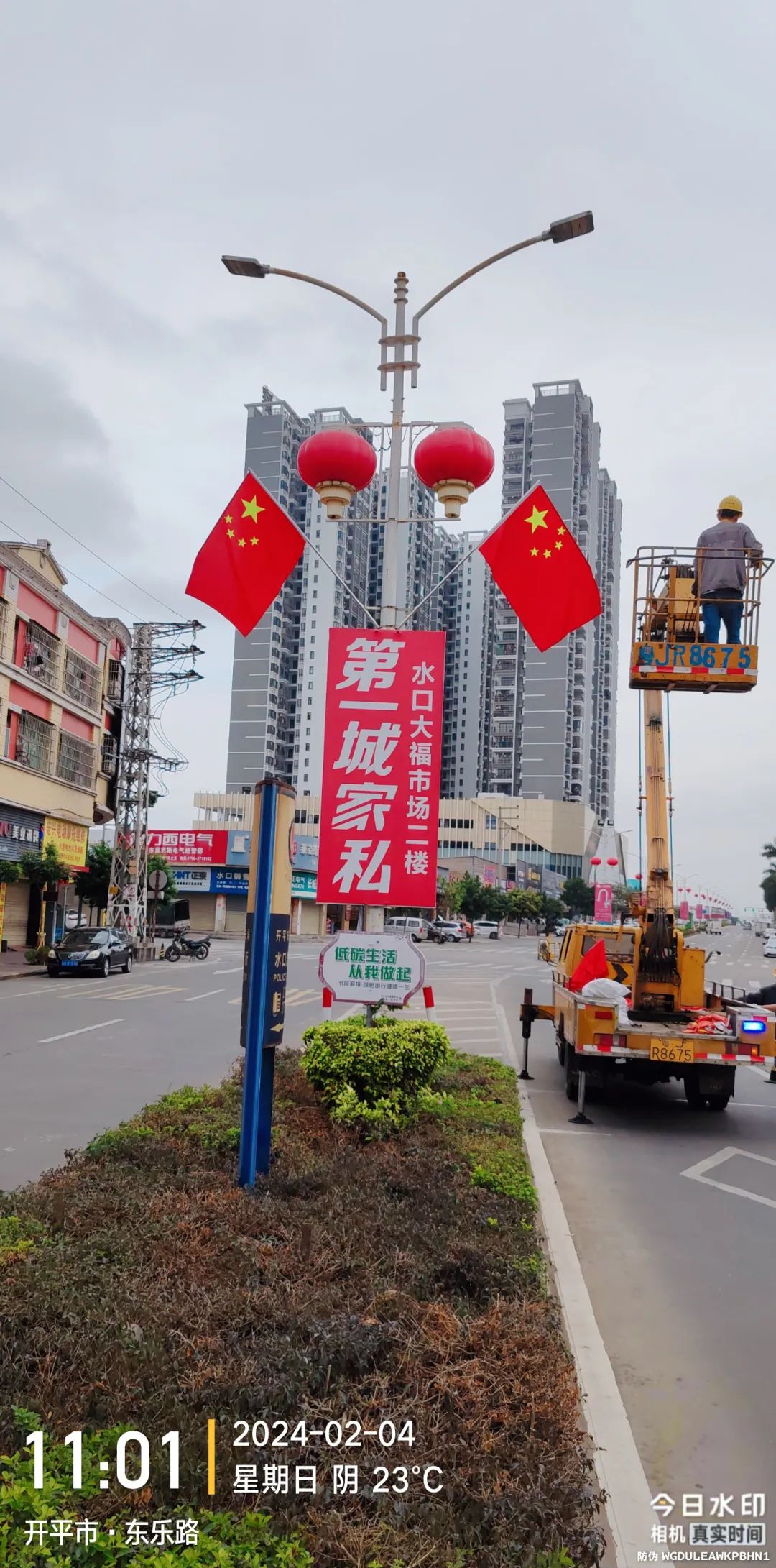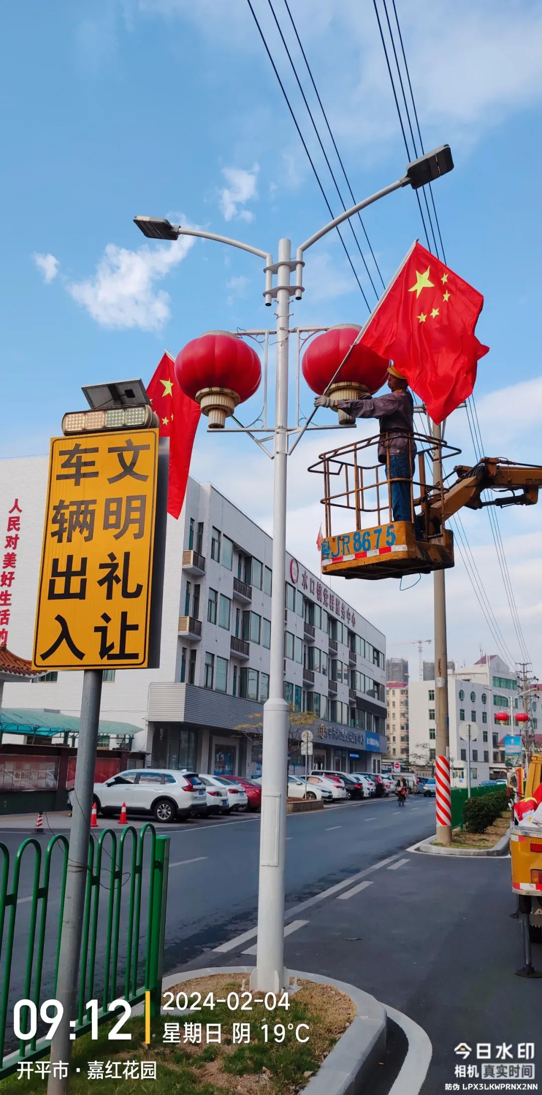 在镇区主干道路路灯杆悬挂崭新鲜艳的国旗,一处处醒目的“中国红”,在成为靓丽风景线的同时,也传递着浓浓的家国情怀,带来了满满的新春仪式感。