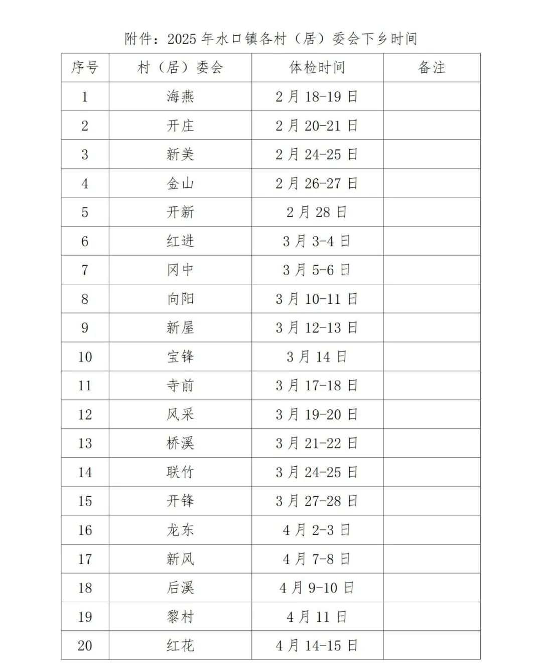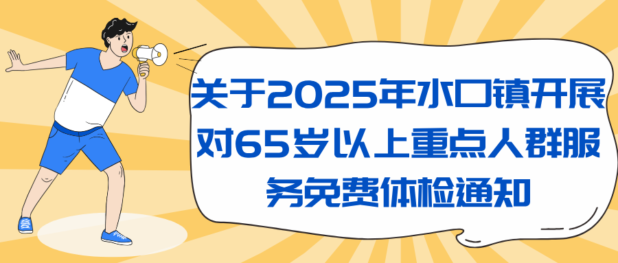 结合《国家基本公共卫生服务项目》及《家庭医生签约履约服务》的要求,辖区内65岁及以上老年人(包括在水口镇居住满半年以上的外户籍居民)提供免费健康服务,进行一年一次的免费体检。请各村(居)委会负责人、乡村医生做好宣传及发动工作。