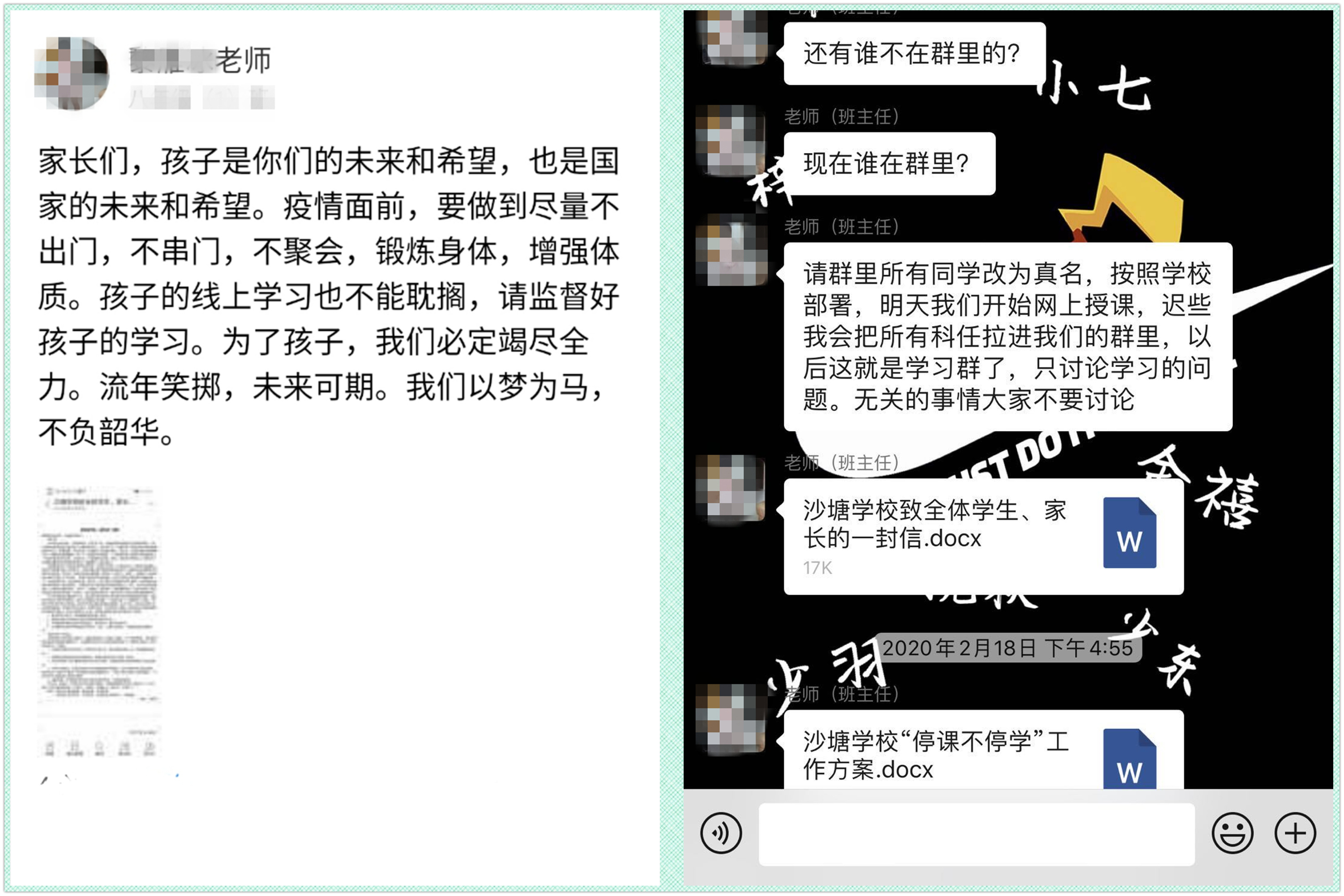 二、宣传引导到位。在教师群、家长群、学生群广泛发布、传播《致全体教师的一封信》《致全体学生、家长的一封信》,把线上教学相关文件通知到每一位师生和家长,引导师生、家长落实防疫精神,做好充足准备,为线上教学顺利开展提供保障。