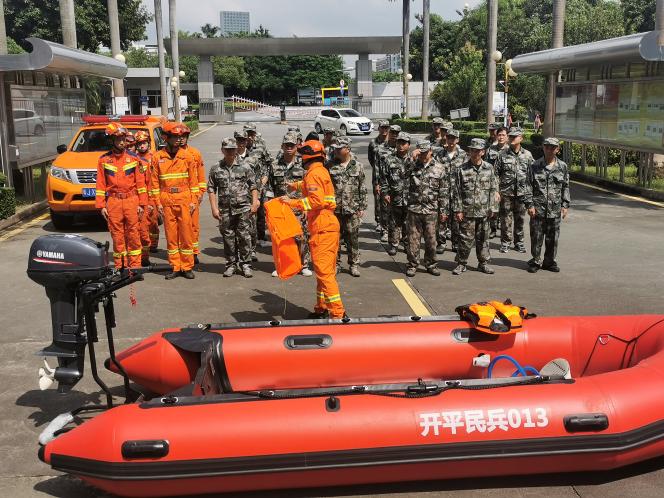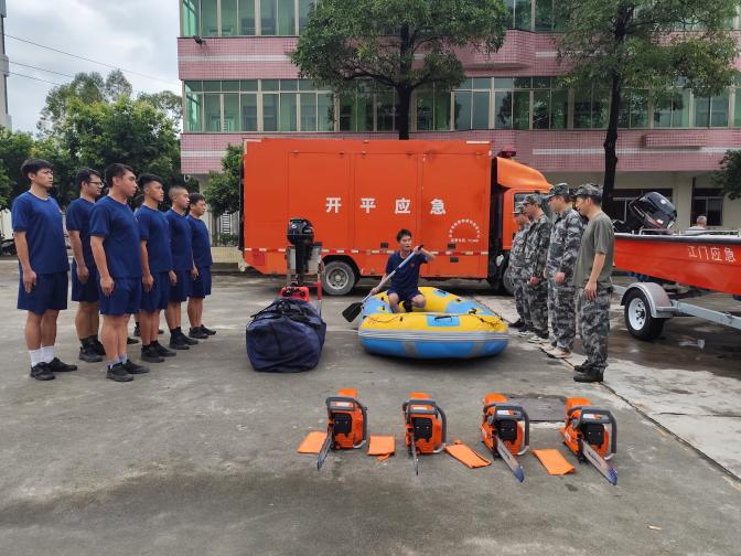 台风来临前,大队组织技术员对所有防汛抢险物资开展拉网式排查。重点针对橡皮艇、救生衣、救生圈等直接关乎生命安全的救援装备,以及油锯、应急照明灯、应急通讯设备等核心工具,逐一进行测试、检修与保养,确保每件装备性能稳定、随时可用;同时核对物资储备数量,对短缺物资及时补充。9月22日上午,为筑牢基层台风防御基础,大队抽调骨干力量前往三埠、长沙街道,为基层救援队伍开展防汛装备专项培训。通过现场展示油锯、橡皮艇等关键装备,结合详细讲解与实操示范,以“帮传带”模式切实提升基层队伍抗台风实战能力。