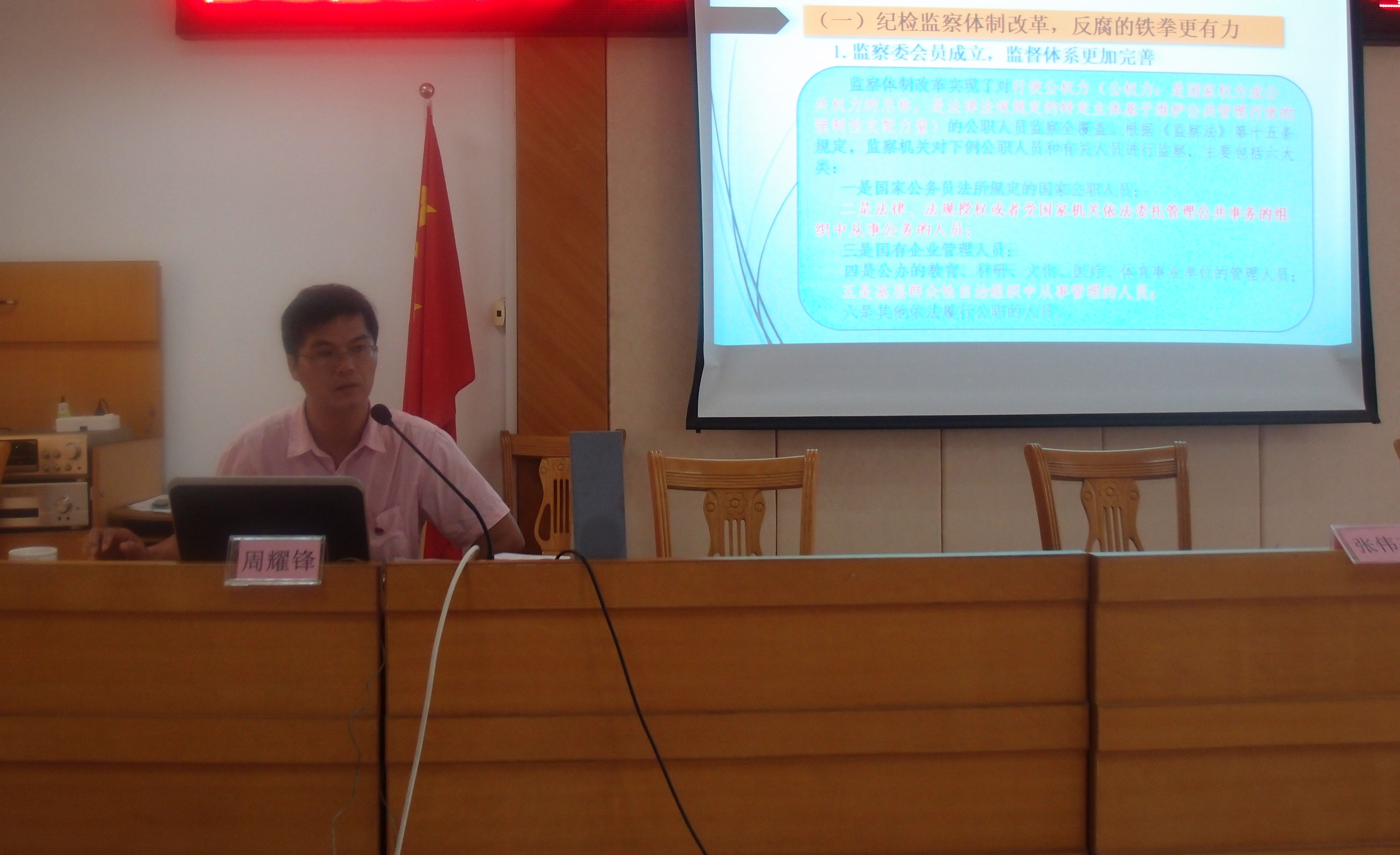 8月27日上午,我局召开专题会议,开展2018年“纪律教育学习月”活动,局机关全体同志(含森林分局民警)和局属单位领导班子、办公室主任等40多人参会,会议由张伟杰局长主持。 会上,我局纪检组长李雪清同志对林业系统开展2018年“纪律教育学习月”活动进行部署安排。随后,张伟杰局长围绕林业工作实际和今年纪律教育学习月活动的主题,对与会党员干部开展一次党性教育,聚焦“工作提效”,针对林业党员干部队伍中存在的作风问题,提出了“紧抓政治建设,深入开展纪律教育学习月活动;紧抓四风整治,切实加强党员干部队伍作风建设;紧抓担当作为,努力推动林业建设高质量发展”等三方面的要求,强调当前正是林业工作者可以主动作为、大有作为的黄金期。全体党员干部要认真落实新时代党的建设总要求,坚持以人民为中心,时刻保持清醒头脑,提高政治站位、强化责任担当,以“加强党的政治建设、营造良好政治生态”的新成效推进林业高质量发展,为建设“文明宜居新城、和谐幸福侨乡”做出新的更大的贡献。 我局在此次会议中特邀市纪委派驻第五纪检组组长周耀锋同志作《监察法》进机关宣讲。他以《学法守法,做敢担当、善作为的清廉干部》为题,从”正确认识当前反腐倡廉新形势新变化、党员违法违纪案件分析、保持清正廉洁的政治本色“等方面内容,倡导要”常怀律己之心、常修为政之德、常思贪欲之害、常戒非分之想“,为大家上了一节内容丰富、内涵深刻、引人深思的党风廉政建设专题宣讲课。特别是通过深入剖析本地典型案例,引导大家以此为鉴,深刻汲取教训,不断提高政治站位和政治觉悟,让严守政治纪律和政治规矩成为政治自觉。 根据我市今年纪律教育学习月活动的工作安排,会议期间集中开展党规党纪知识测试,进一步加强对党员干部的党规党纪教育。会议还安排播放我市有关精准扶贫工作方面的暗访片和保密警示教育片,深化警示效果,强化保密意识,做到警钟长鸣,筑牢保密防线。