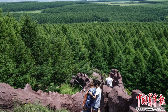 7月12日,河北围场满族蒙古族自治县,塞罕坝机械林场亮兵台,两名游客自拍。亮兵台方圆十几公里内均为落叶松人工林。中国青年报·中青在线记者 李峥苨/摄
