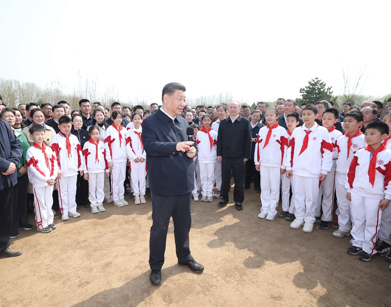 习近平在参加首都义务植树活动时强调 全民植树增绿 共建美丽中国 李强赵乐际王沪宁蔡奇丁薛祥李希韩正参加 4月3日,党和国家领导人习近平、李强、赵乐际、王沪宁、蔡奇、丁薛祥、李希、韩正等来到北京市通州区潞城镇参加首都义务植树活动。这是习近平同大家一起植树。新华社记者 鞠鹏 摄 4月3日,党和国家领导人习近平、李强、赵乐际、王沪宁、蔡奇、丁薛祥、李希、韩正等来到北京市通州区潞城镇参加首都义务植树活动。这是习近平同少先队员在一起。新华社记者 李学仁 摄 新华社北京4月3日电 中共中央总书记、国家主席、中央军委主席习近平3日上午在参加首都义务植树活动时强调,清明前后,神州大地处处生机盎然,正是植树的好时节。今天我们一起种树,就是要号召大家都行动起来,积极参与植树造林,人人争当绿色使者、生态先锋,为建设美丽中国增绿添彩,共同谱写人与自然和谐共生的中国式现代化新篇章。 京郊大地,春意正浓。上午10时40分许,党和国家领导人习近平、李强、赵乐际、王沪宁、蔡奇、丁薛祥、李希、韩正等集体乘车,来到北京市通州区潞城镇,同首都群众一起参加义务植树。 4月3日,党和国家领导人习近平、李强、赵乐际、王沪宁、蔡奇、丁薛祥、李希、韩正等来到北京市通州区潞城镇参加首都义务植树活动。这是习近平扛起铁锹走向植树地点。新华社记者 庞兴雷 摄 植树点地处北京市通州区与河北省廊坊市北三县交界地区,位于潮白河畔京冀首个跨界共建的森林公园内,具有良好的滨水生态条件。 看到总书记来了,正在植树的干部群众热情地向总书记问好。习近平向大家挥手致意,扛起铁锹走向植树地点,同北京市、国家林业和草原局负责同志以及首都干部群众、少先队员一起忙碌起来。 4月3日,党和国家领导人习近平、李强、赵乐际、王沪宁、蔡奇、丁薛祥、李希、韩正等来到北京市通州区潞城镇参加首都义务植树活动。这是习近平同大家一起植树。新华社记者 鞠鹏 摄 4月3日,党和国家领导人习近平、李强、赵乐际、王沪宁、蔡奇、丁薛祥、李希、韩正等来到北京市通州区潞城镇参加首都义务植树活动。这是习近平同少先队员一起给刚栽下的树苗浇水。新华社记者 鞠鹏 摄 挥锹铲土、培土围堰、提水浇灌……习近平接连种下油松、黄栌、元宝枫、樱桃、红叶碧桃、侧柏等多棵树苗。习近平一边植树,一边询问孩子们的学习生活、劳动锻炼情况。他强调,广大青少年是祖国的未来,从小要积极参加劳动、植树造林,把绿色的种子种进心里,养成尊重自然、热爱自然的意识,勤奋学习、锻炼身体、茁壮成长,德智体美劳全面发展,努力成为国家栋梁。植树现场一派热火朝天的劳动景象,领导同志们同大家一起培土浇水,气氛热烈。 4月3日,党和国家领导人习近平、李强、赵乐际、王沪宁、蔡奇、丁薛祥、李希、韩正等来到北京市通州区潞城镇参加首都义务植树活动。这是习近平同参加植树的干部群众、少先队员亲切交谈。新华社记者 鞠鹏 摄 植树期间,习近平同在场的干部群众亲切交谈。他说,到中央工作后,他已连续17年参加首都义务植树活动。他指出,今年是新中国植树节设立45周年。全国人民坚持植树造林,荒山披锦绣,沙漠变绿洲,成就举世瞩目。同时要看到,我国缺林少绿问题仍然突出,森林“宝库”作用发挥还不够充分。增绿就是增优势,植树就是植未来。要一茬接着一茬种,一代接着一代干,不断增厚我们的“绿色家底”。 4月3日,党和国家领导人习近平、李强、赵乐际、王沪宁、蔡奇、丁薛祥、李希、韩正等来到北京市通州区潞城镇参加首都义务植树活动。这是习近平同少先队员在一起。新华社记者 鞠鹏 摄 习近平强调,绿化祖国要扩绿、兴绿、护绿并举。扩绿,就是要科学推进大规模国土绿化,适地适树、适时适法,种一棵活一棵、造一片成一片。兴绿,就是要注重质量效益,拓展绿水青山转化为金山银山的路径,推动森林“水库、钱库、粮库、碳库”更好联动,实现生态效益、经济效益、社会效益相统一。护绿,就是要加强林草资源保护,做好防灭火工作,深入开展重大隐患排查整治,守护好来之不易的绿化成果。三北地区是国土绿化的主战场,要把更多力量集中到“三北”工程建设上来,筑牢北疆绿色长城。 4月3日,党和国家领导人习近平、李强、赵乐际、王沪宁、蔡奇、丁薛祥、李希、韩正等来到北京市通州区潞城镇参加首都义务植树活动。这是习近平同少先队员在一起。新华社记者 鞠鹏 摄 习近平指出,绿化祖国要人人尽责。要畅通群众参与渠道、创新尽责形式,发挥好林长制作用,把各方面力量调动起来,推动全民义务植树不断走深走实。 在京中共中央政治局委员、中央书记处书记、国务委员等参加植树活动。