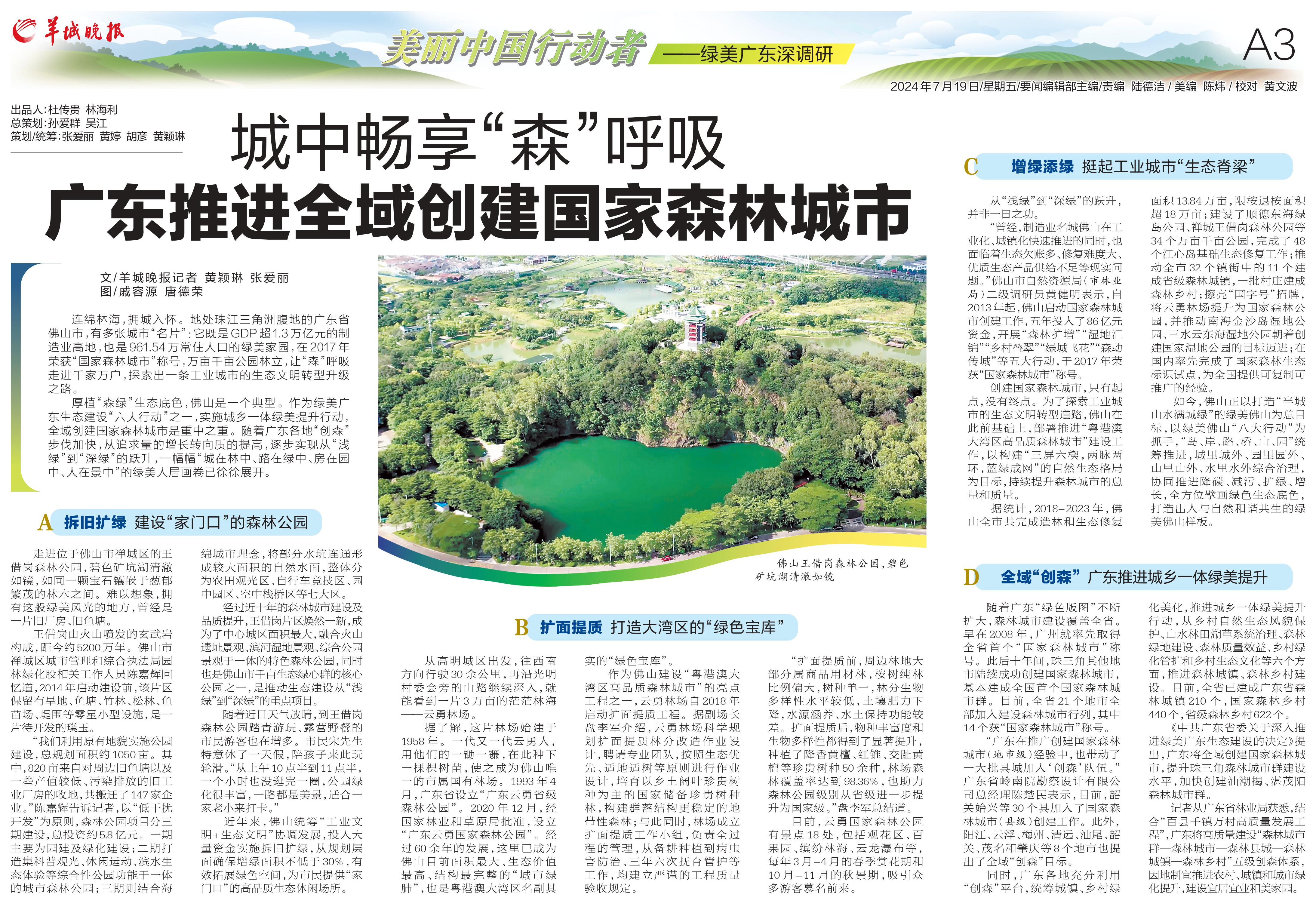 连绵林海,拥城入怀。地处珠江三角洲腹地的广东省佛山市,有多张城市“名片”:它既是GDP超1.3万亿元的制造业高地,也是961.54万常住人口的绿美家园,在2017年荣获“国家森林城市”称号,万亩千亩公园林立,让“森”呼吸走进千家万户,探索出一条工业城市的生态文明转型升级之路。 羊城晚报2024年7月19日A3版版面图 厚植“森绿”生态底色,佛山是一个典型。作为绿美广东生态建设“六大行动”之一,实施城乡一体绿美提升行动,全域创建国家森林城市是重中之重。随着广东各地“创森”步伐加快,从追求量的增长转向质的提高,逐步实现从“浅绿”到“深绿”的跃升,一幅幅“城在林中、路在绿中、房在园中、人在景中”的绿美人居画卷已徐徐展开。 拆旧扩绿建设“家门口”的森林公园 走进位于佛山市禅城区的王借岗森林公园,碧色矿坑湖清澈如镜,如同一颗宝石镶嵌于葱郁繁茂的林木之间。难以想象,拥有这般绿美风光的地方,曾经是一片旧厂房、旧鱼塘。 王借岗森林公园,碧色矿坑湖清澈如镜 王借岗由火山喷发的玄武岩构成,距今约5200万年。佛山市禅城区城市管理和综合执法局园林绿化股相关工作人员陈嘉辉回忆道,2014年启动建设前,该片区保留有旱地、鱼塘、竹林、松林、鱼苗场、堤围等零星小型设施,是一片待开发的璞玉。 王借岗森林公园 “我们利用原有地貌实施公园建设,总规划面积约1050亩。其中,820亩来自对周边旧鱼塘以及一些产值较低、污染排放的旧工业厂房的收地,共搬迁了147家企业。”陈嘉辉表示,以“低干扰开发”为原则,森林公园项目分三期建设,总投资约5.8亿元。一期主要为园建及绿化建设;二期打造集科普观光、休闲运动、滨水生态体验等综合性公园功能于一体的城市森林公园;三期则结合海绵城市理念,将部分水坑连通形成较大面积的自然水面,整体分为农田观光区、自行车竞技区、园中园区、空中栈桥区等七大区。 王借岗森林公园 经过近十年的森林城市建设及品质提升,王借岗片区焕然一新,成为了中心城区面积最大,融合火山遗址景观、滨河湿地景观、综合公园景观于一体的特色森林公园,同时也是佛山市千亩生态绿心群的核心公园之一,是推动生态建设从“浅绿”到“深绿”的重点项目。 王借岗森林公园林木葱郁繁茂 随着近日天气放晴,到王借岗森林公园踏青游玩、露营野餐的市民游客也在增多。市民宋先生特意休了一天假,陪孩子来此玩轮滑。“从上午10点半到11点半,一个小时也没逛完一圈,公园绿化很丰富,一路都是美景,适合一家老小来打卡。” 近年来,佛山统筹“工业文明+生态文明”协调发展,投入大量资金实施拆旧扩绿,从规划层面确保增绿面积不低于30%,有效拓展绿色空间,为市民提供“家门口”的高品质生态休闲场所。 扩面提质打造大湾区的“绿色宝库” 从高明城区出发,往西南方向行驶30余公里,再沿光明村委会旁的山路继续深入,就能看到一片3万亩的茫茫林海——云勇林场。 广东云勇国家森林公园 据了解,这片林场始建于1958年。一代又一代云勇人,用他们的一锄一镰,在此种下一棵棵树苗,使之成为佛山唯一的市属国有林场。1993年4月,广东省设立“广东云勇省级森林公园”。2020年12月,经国家林业和草原局批准,设立“广东云勇国家森林公园”。经过60余年的发展,这里已成为佛山目前面积最大、生态价值最高、结构最完整的“城市绿肺”,也是粤港澳大湾区名副其实的“绿色宝库”。 广东云勇国家森林公园 作为佛山建设“粤港澳大湾区高品质森林城市”的亮点工程之一,云勇林场自2018年启动扩面提质工程。据副场长盘李军介绍,云勇林场科学规划扩面提质林分改造作业设计,聘请专业团队,按照生态优先、适地适树等原则进行作业设计,培育以乡土阔叶珍贵树种为主的国家储备珍贵树种林,构建群落结构更稳定的地带性森林;与此同时,林场成立扩面提质工作小组,负责全过程的管理,从备耕种植到病虫害防治、三年六次抚育管护等工作,均建立严谨的工程质量验收规定。 云勇国家森林公园处处绿意葱茏 “扩面提质前,周边林地大部分属商品用材林,桉树纯林比例偏大,树种单一,林分生物多样性水平较低,土壤肥力下降,水源涵养、水土保持功能较差。扩面提质后,物种丰富度和生物多样性都得到了显著提升,种植了降香黄檀、红锥、交趾黄檀等珍贵树种50余种,林场森林覆盖率达到98.36%,也助力森林公园级别从省级进一步提升为国家级。”盘李军总结道。 云勇林场 目前,云勇国家森林公园有景点18处,包括观花区、百果园、缤纷林海、云龙瀑布等,每年3月-4月的春季赏花期和10月-11月的秋景期,吸引众多游客慕名前来。 增绿添绿挺起工业城市“生态脊梁” 从“浅绿”到“深绿”的跃升,并非一日之功。 “曾经,制造业名城佛山在工业化、城镇化快速推进的同时,也面临着生态欠账多、修复难度大、优质生态产品供给不足等现实问题。”佛山市自然资源局(市林业局)二级调研员黄健明表示,自2013年起,佛山启动国家森林城市创建工作,五年投入了86亿元资金,开展“森林扩增”“湿地汇锦”“乡村叠翠”“绿城飞花”“森动传城”等五大行动,于2017年荣获“国家森林城市”称号。 创建国家森林城市,只有起点,没有终点。为了探索工业城市的生态文明转型道路,佛山在此前基础上,部署推进“粤港澳大湾
