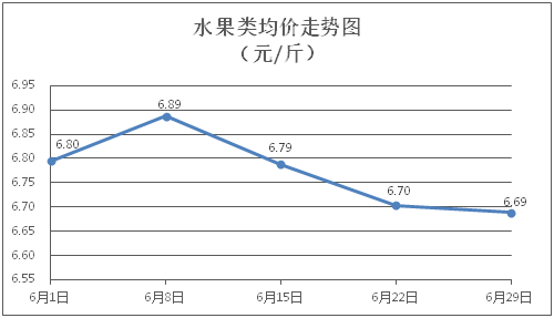 水果类商品价格微幅波动。所监测的6种水果商品价格波动情况为1涨3跌2平,综合零售均价为每斤6.69元,环比下降0.22%。其中橙子、苹果、葡萄零售均价分别为每斤6.44元、7.63元、13.92元,环比分别下降0.31%、上涨0.39%、下降0.57%。