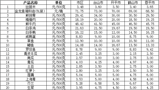 说明:1、表中价格为该地区监测点上周综合平均价;2、“市区”含蓬江区、江海区、新会区,价格分别采自蓬江市场、江南市场、城东市场等13家农贸市场;3、其他四个县市价格分别采自新华市场、锦江市场等8家农贸市场。