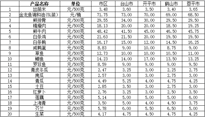 说明:1、表中价格为该地区监测点综合平均价;2、“市区”含蓬江区、江海区、新会区,价格分别采自蓬江市场、江南市场、城东市场等13家农贸市场;3、其他四个县市价格分别采自新华市场、锦江市场等8家农贸市场。