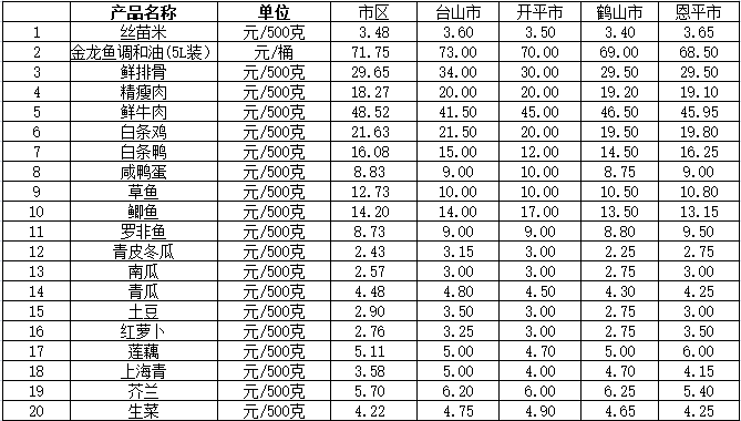 说明:1、表中价格为该地区监测点上周综合平均价;2、“市区”含蓬江区、江海区、新会区,价格分别采自蓬江市场、江南市场、城东市场等13家农贸市场;3、其他四个县市价格分别采自新华市场、锦江市场等8家农贸市场。