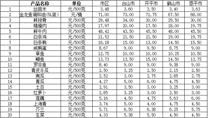 说明:1、表中价格为该地区监测点上周综合平均价;2、“市区”含蓬江区、江海区、新会区,价格分别采自蓬江市场、江南市场、城东市场等13家农贸市场;3、其他四个县市价格分别采自新华市场、锦江市场等8家农贸市场。