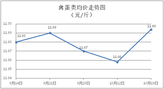 禽蛋类商品价格微幅上涨。所监测的5种禽蛋类商品价格波动情况为4涨1平,综合零售均价为每斤11.69元,环比上涨0.31%。其中:白条鸡、白条鸭零售均价分别为每斤20.90元、15.22元,环比分别上涨0.34%、上涨0.40%;鸡蛋、鸭蛋零售均价分别为每斤6.39元、7.07元,环比分别上涨0.31%、上涨0.43%。