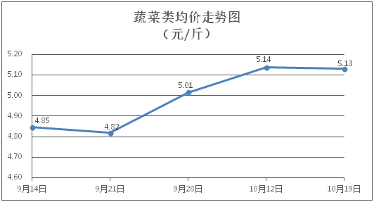 蔬菜类商品价格总体略降。所监测的32 种蔬菜商品价格波动情况为9涨18跌5平,综合零售均价为每斤5.13元,环比下降0.15%。其中:涨幅居前的品种包括青尖椒、苦瓜、芥兰,零售均价分别为每斤6.17元、5.52元、6.00元,环比分别上涨6.75%、2.41%、1.01%;跌幅靠前的品种为花菜、白萝卜、莴笋,零售均价分别为每斤5.40元、2.29元、4.97元,环比分别下降2.70%、2.14%、1.97%。