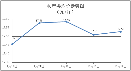 水产类商品价格小幅波动。所监测的9种水产商品价格波动情况为2涨3跌4平,综合均价为每斤17.53元,环比上涨0.10%。其中:草鱼、鲫鱼、鳙鱼、基围虾零售均价分别为每斤11.29元、13.99元、10.63元、29.00元,环比分别持平、下降0.50%、下降0.65%、上涨0.21%。