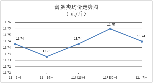 禽蛋类商品价格窄幅盘整。所监测的禽蛋类商品价格波动情况为1涨1跌3平,综合零售均价为每斤11.74元,环比下降0.09%。其中:白条鸡、白条鸭零售均价分别为每斤20.94元、15.29元,环比分别下降0.33%、上涨0.13%;鸡蛋、咸鸭蛋零售均价分别为每斤6.35元、8.93元,环比均持平。