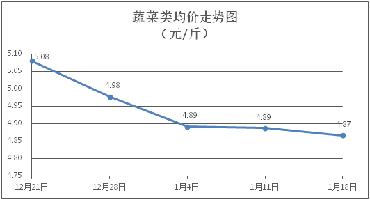 蔬菜类商品价格以降为主。所监测的蔬菜商品价格波动情况为10涨20跌2平,综合零售均价为每斤4.87元,环比下降0.42%。其中:涨幅居前的品种包括椰菜、青豆角、水空心菜,零售均价分别为每斤3.14元、6.54元、4.98元,环比分别上涨3.29%、2.51%、2.26%;跌幅靠前的品种为水东芥菜、青瓜、花菜,零售均价分别为每斤3.71元、4.61元、4.42元,环比分别下降4.38%、3.35%、2.64%。