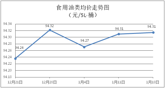 食用油类商品价格基本平稳。所监测的食用油(5L装)商品价格波动情况为2涨1跌6平,综合零售均价为每桶94.31元,环比上涨0.005%。其中:鲁花花生油、金龙鱼调和油零售均价分别为每桶155.92元、70.83元,环比分别上涨0.06%、持平。