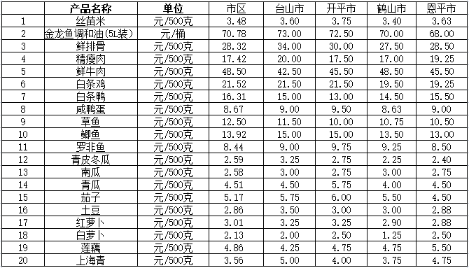 说明:1、表中价格为该地区监测点上周综合平均价;2、“市区”含蓬江区、江海区、新会区,价格分别采自蓬江市场、江南市场、城东市场等13家农贸市场;3、其他四个县市价格分别采自新华市场、锦江市场等8家农贸市场。