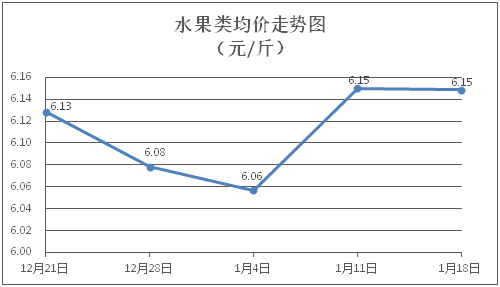 水果类商品价格窄幅盘整。所监测的水果商品价格波动情况为1涨1跌4平,综合零售均价为每斤6.15元,环比下降0.03%。其中橙子、苹果、香蕉零售均价分别为每斤5.65元、7.90元、2.78元,环比分别下降0.70%、持平、上涨1.09%。