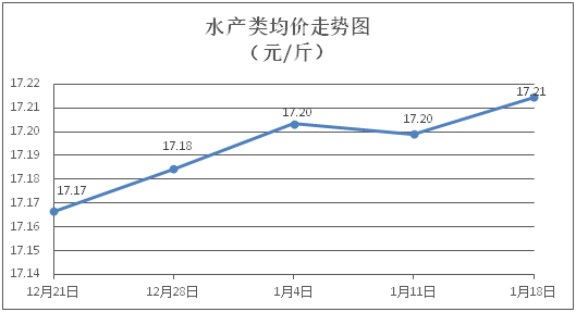 水产类商品价格稳中略涨。所监测的水产商品价格波动情况为3涨1跌5平,综合均价为每斤17.21元,环比上涨0.09%。其中:草鱼、鲫鱼、罗非鱼、基围虾零售均价分别为每斤11.46元、14.04元、8.83元、27.96元,环比分别持平、上涨1.30%、上涨0.23%、下降0.29%。