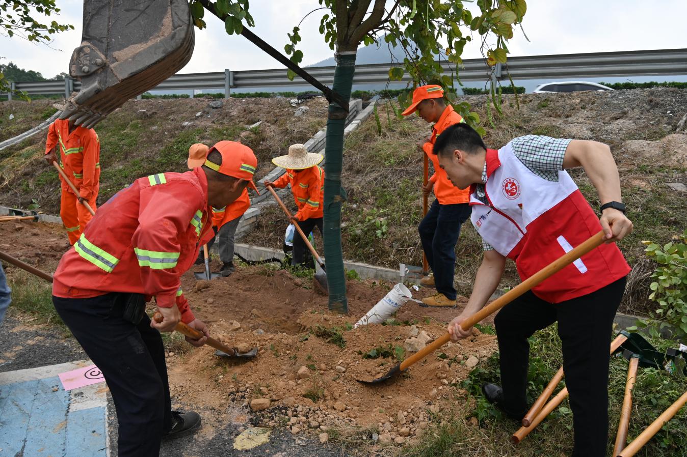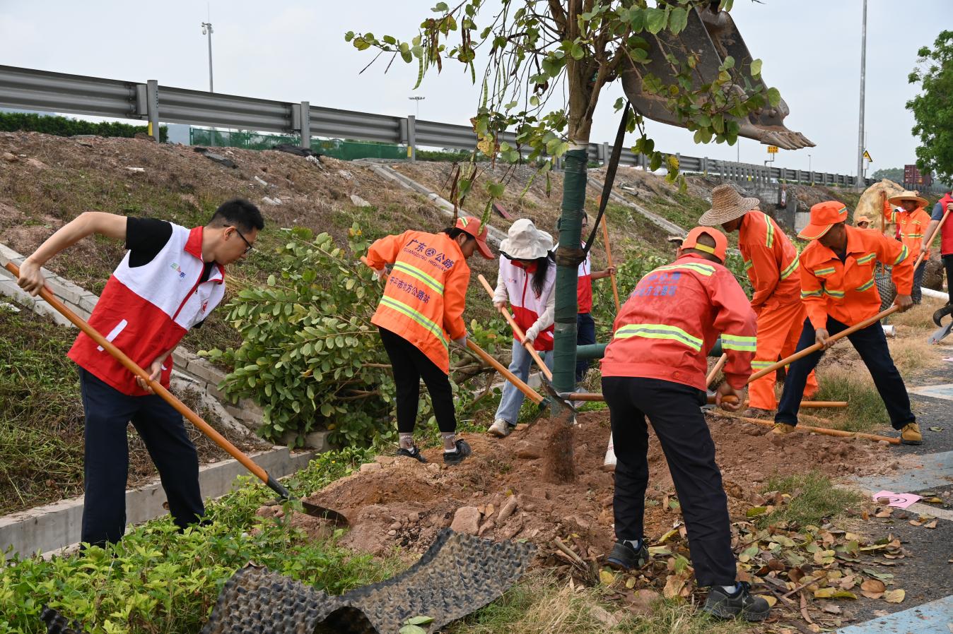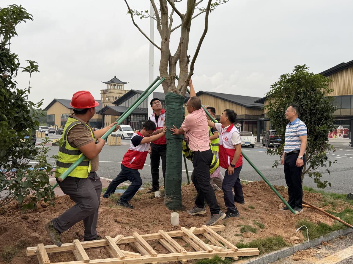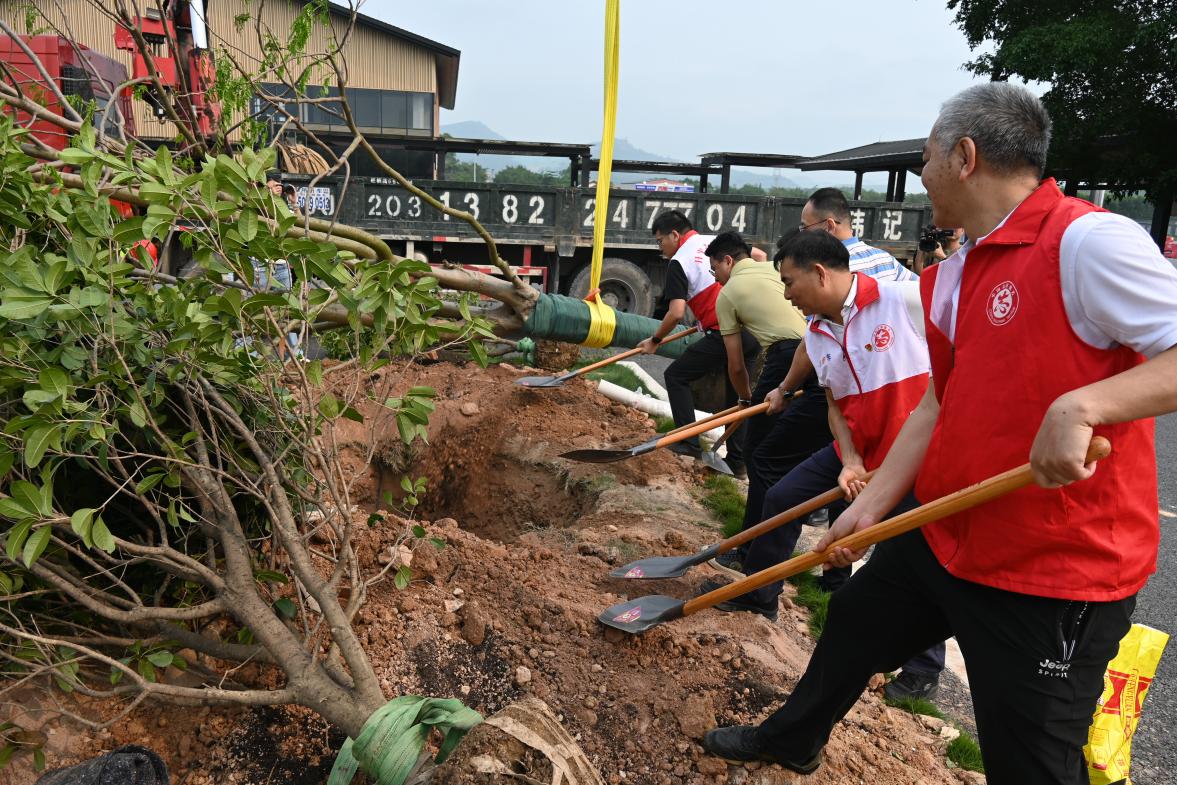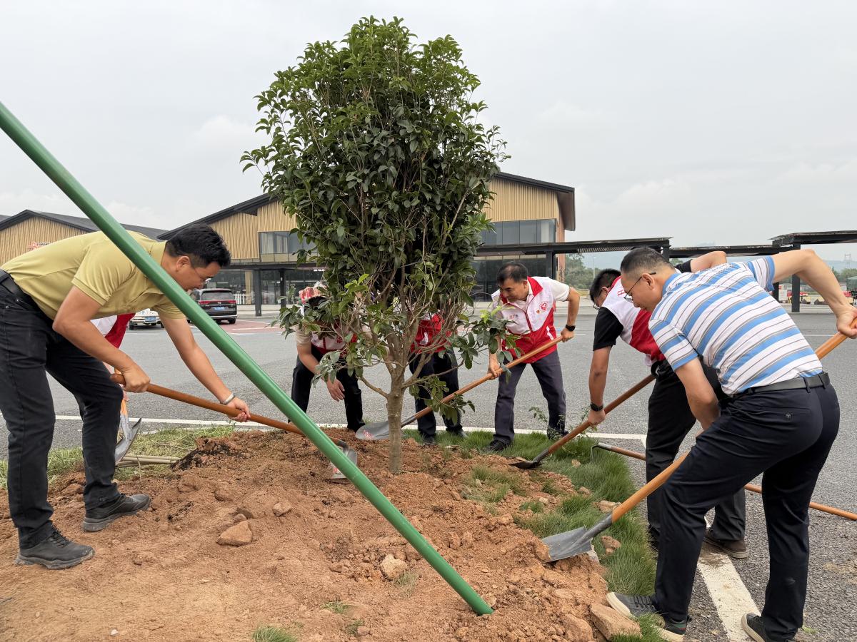 上午9时,活动正式启动,全体人员迅速投入植树劳动。大家分工协作、配合默契,挥锹培土、扶正树苗、提水浇灌,各个环节衔接有序、高效推进。经过近一小时的辛勤劳作,23株凤凰木、桂花、宫粉紫荆、蒲葵、铁冬青等树苗在梁金山服务区内扎根挺立。新绿错落,不仅扮靓了交通窗口,也为过往司乘铺展出一条更生态、更舒适的绿色通行通道。