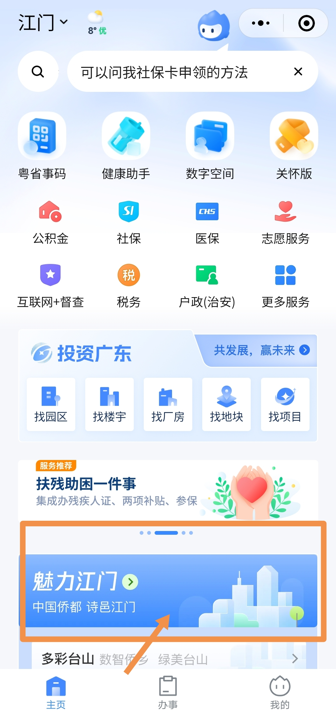 在“粤省事”APP、小程序将地址切换成“江门市”,点击“魅力江门”进入专区,在首页的对应专栏点击相关服务事项即可办理。以办理引进博士、出站博士后生活补贴为例,在“魅力江门”专区首页“高层次人才”专栏,选择“引进博士、出站博士后生活补贴”服务事项进行办理。若市民还想办理更多人社业务,可通过搜索栏输入社保卡业务、社会保险、就业创业、人才服务、劳动仲裁等关键字进行查找,亦可点击“高层次人才”专栏旁边的“更多”跳转到“广东省人力资源和社会保障厅”办理全省人社服务事项。